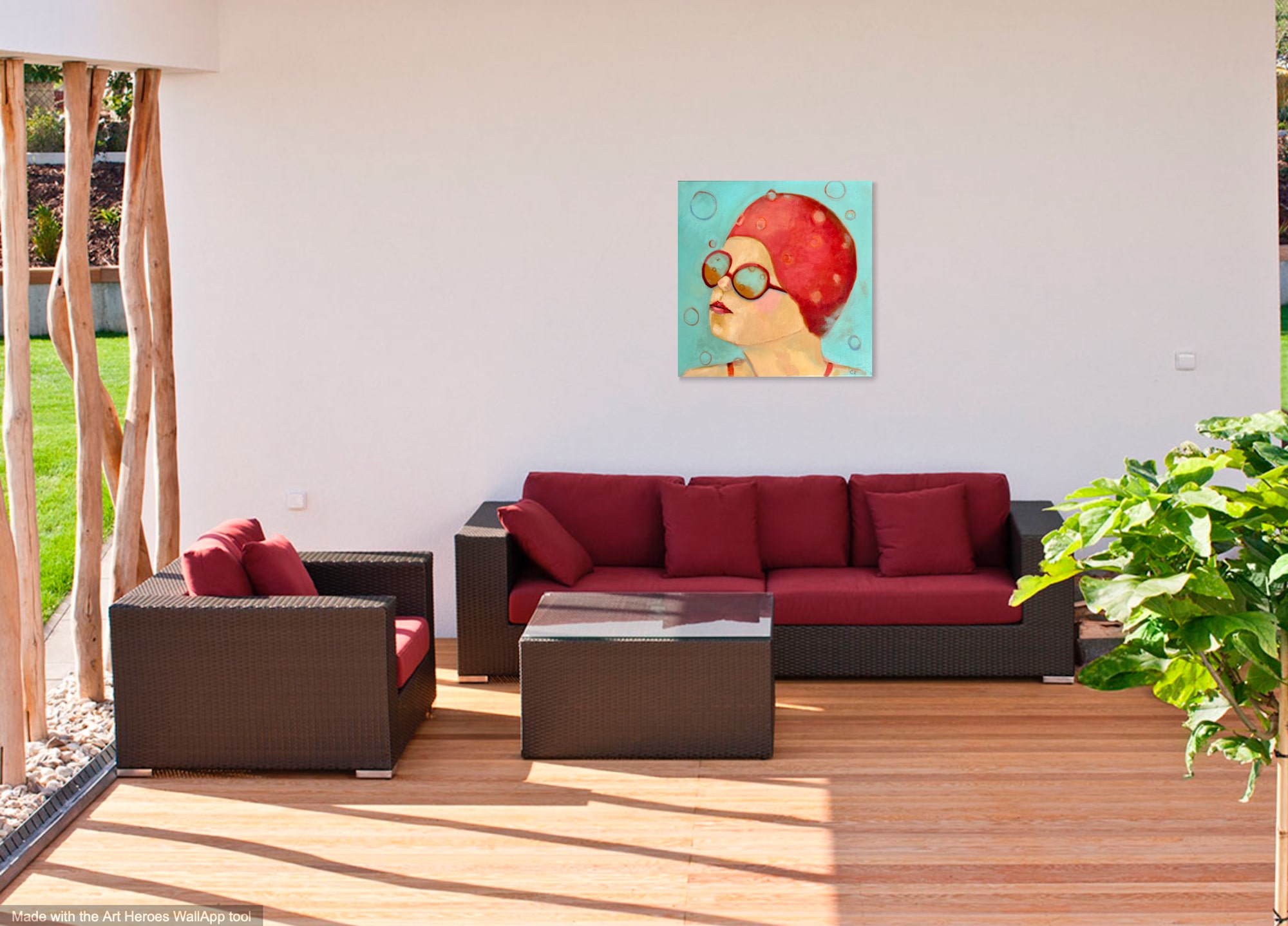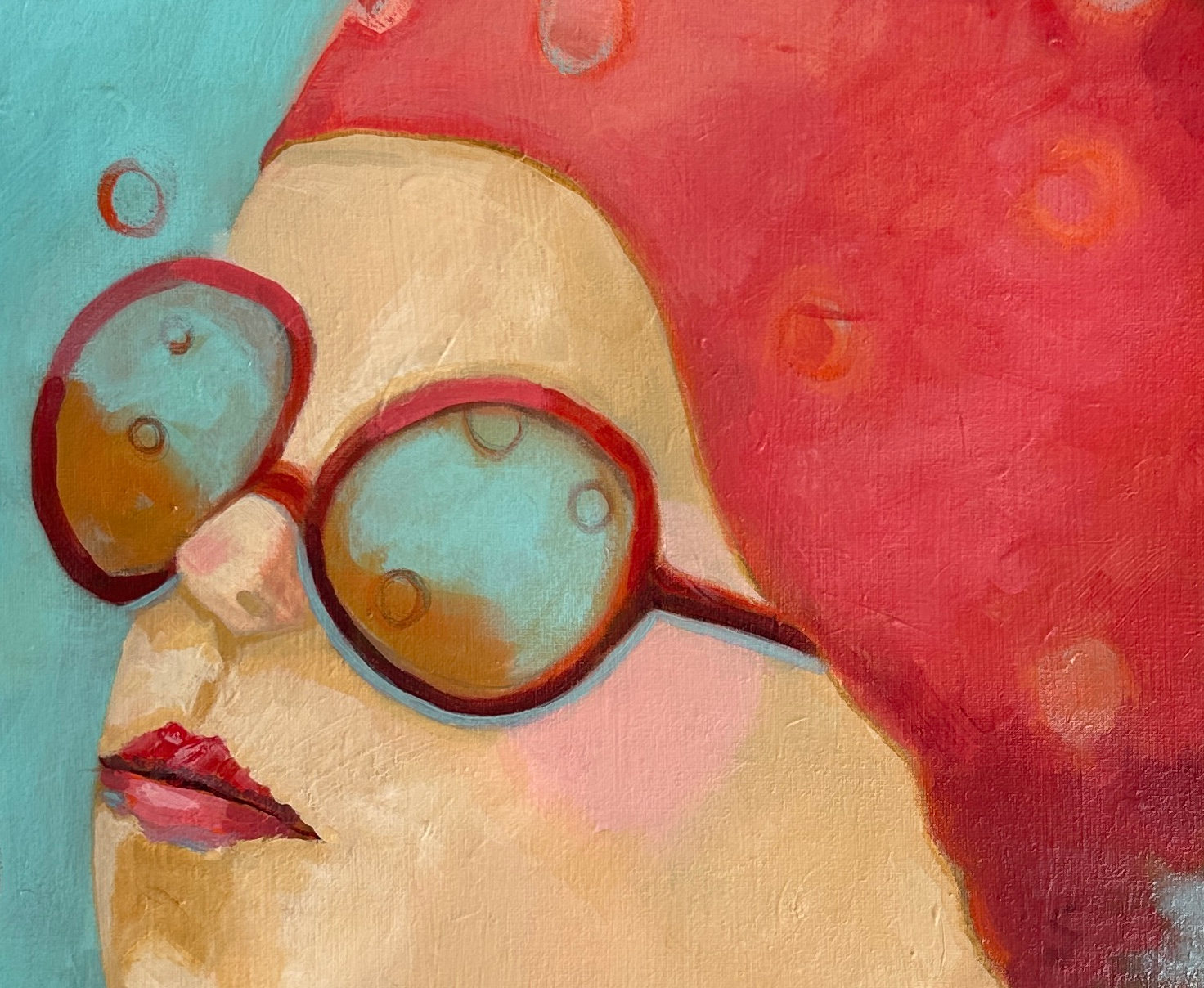 This is striking painting in bright red and teal. The subject is a cool swimmer in sun glasses inspired by family photographs and vintage images.