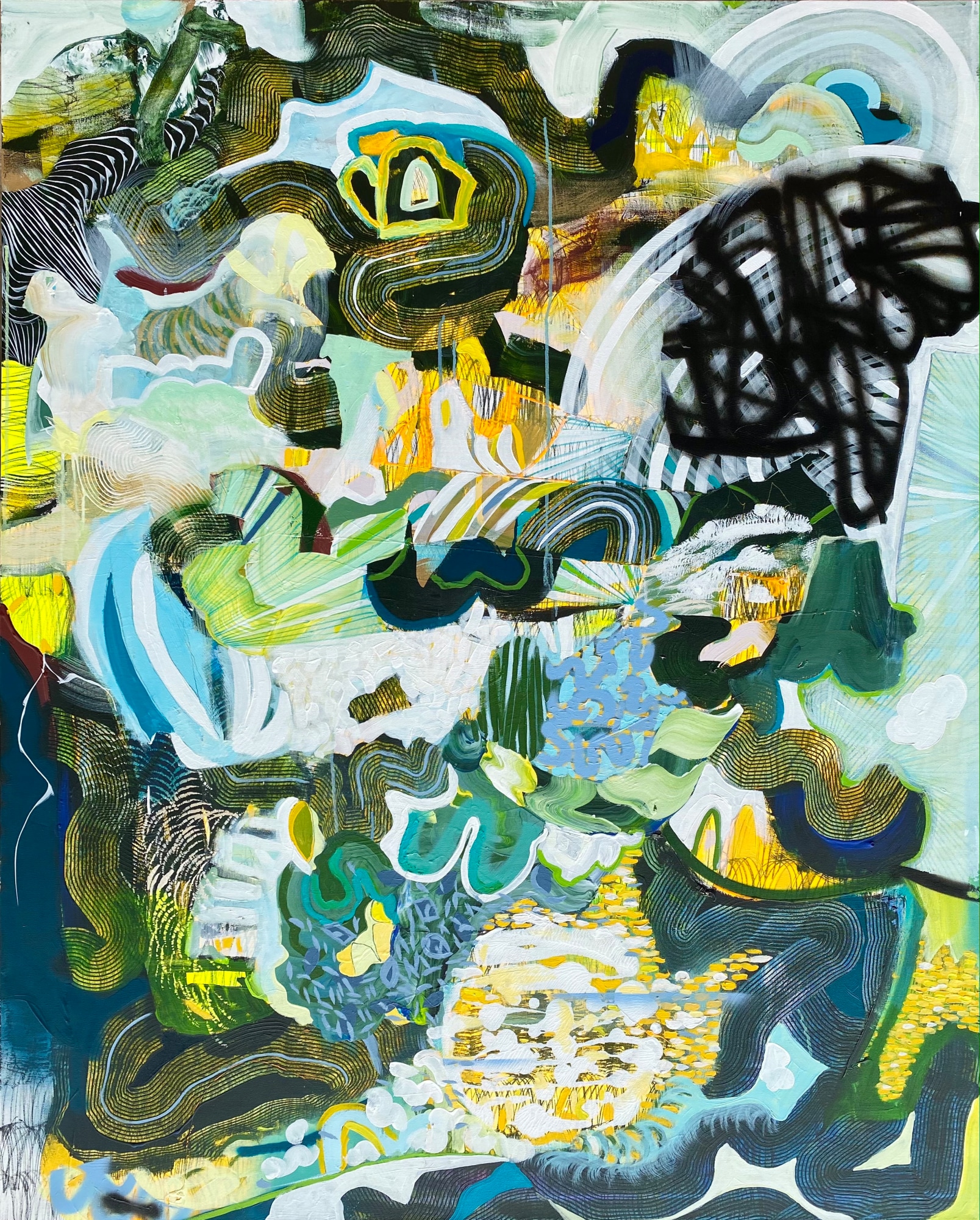 acrylic, spray paint, ink, paint pens on canvas