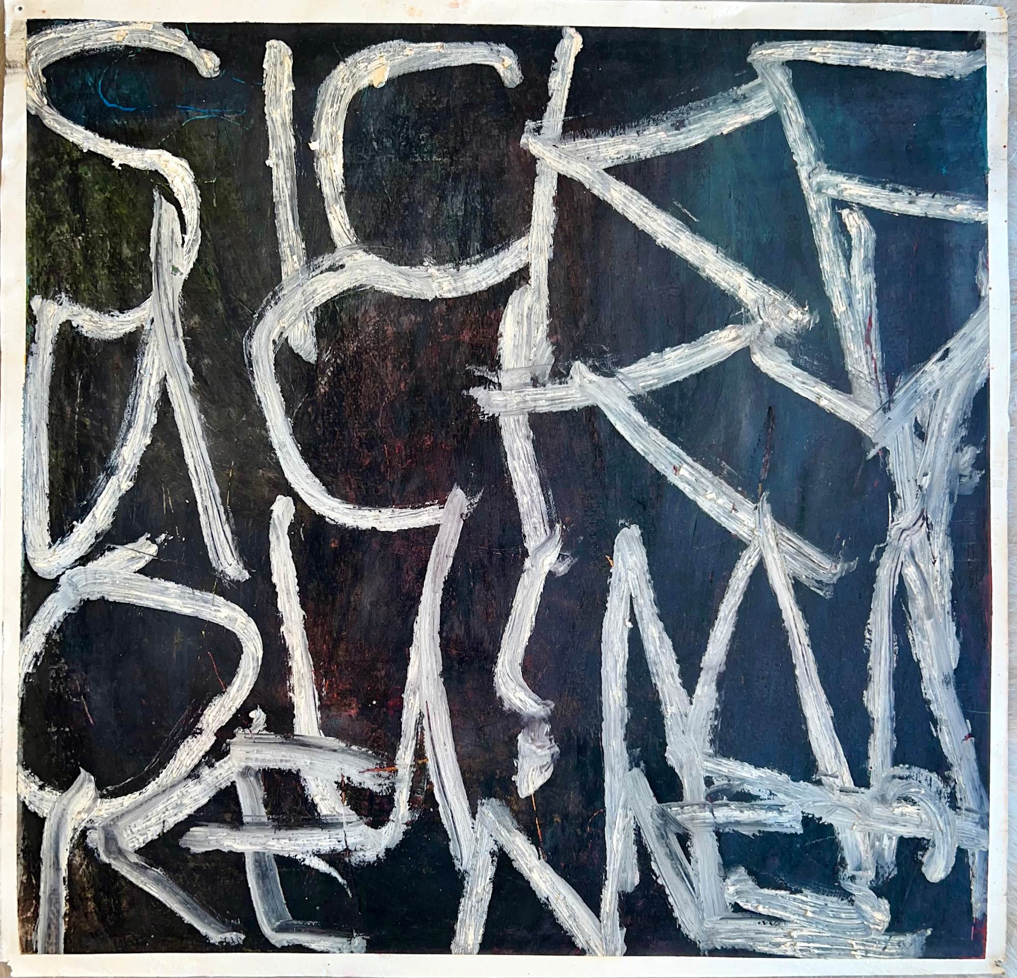 Abstract expressive white lettering on black background with subtle hints of color showing through the layers. Energetic and bold.