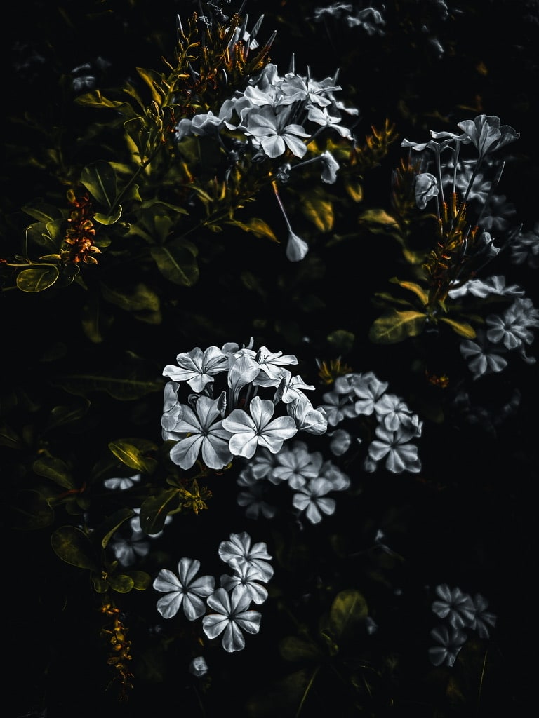 The petals of a plumbago bloom illuminate with a ghostly glow against a background that shadows the plant in darkness.