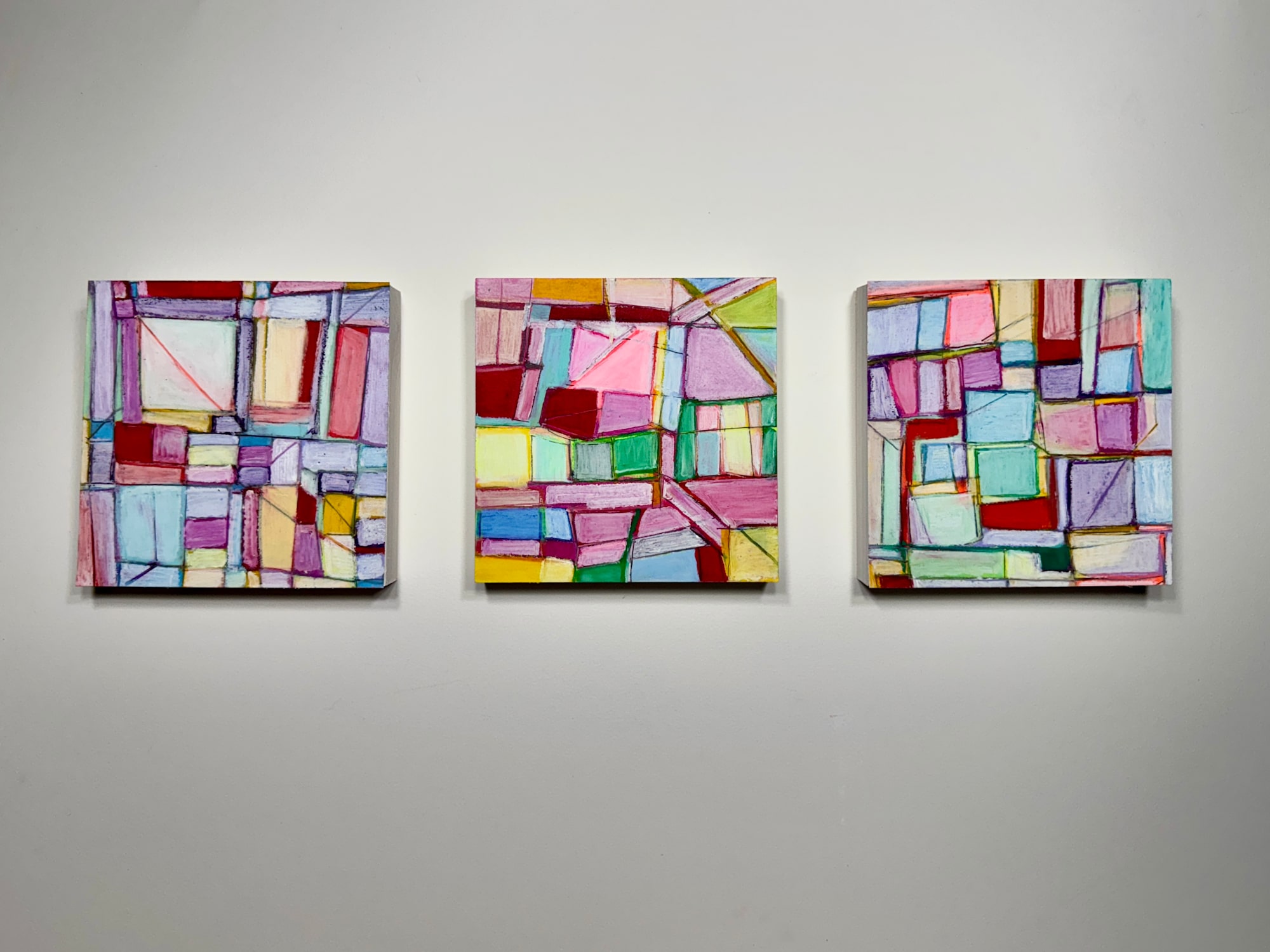 Triptych. Abstract shapes in bright colors using oil pastels and mixed media on paper mounted on wood panel. Ready to hang.