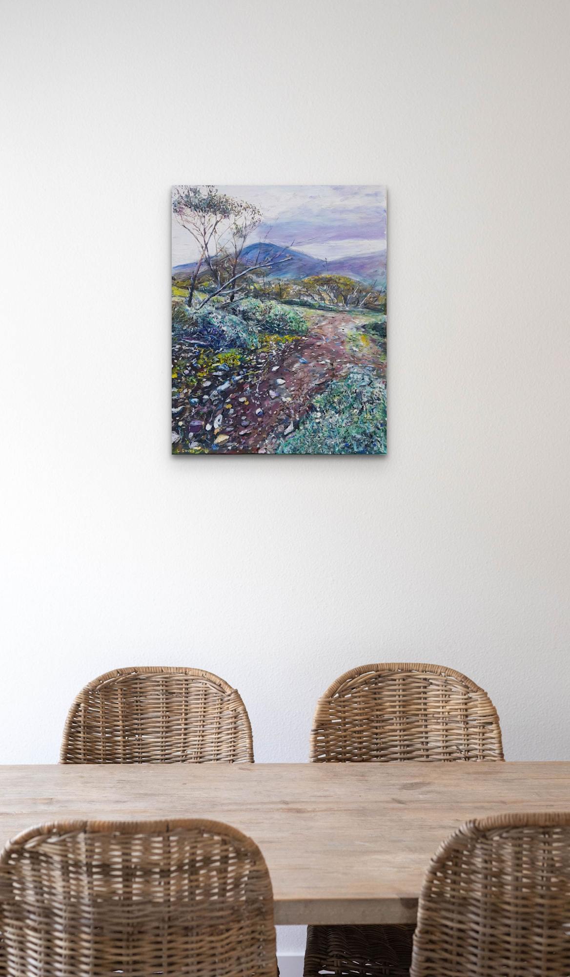 The artwork `Adelaide Hills Landscape` captures the serene beauty of the South Australian countryside. The artist has masterfully depicted the rolling hills, rocky terrain, and sparse vegetation with a keen eye for detail. The muted color palette evokes a sense of tranquility, while the varied lines and shapes add depth and visual interest to the composition. As we gaze upon this painting, we are transported to a quiet corner of the Adelaide Hills, where time seems to stand still. The dusty path beckons us to take a leisurely stroll, admiring the rugged beauty of the landscape. The distant mountains loom majestically in the hazy background, their peaks obscured by swirling clouds. The textured brushstrokes lend a sense of realism to the scene, inviting us to reach out and touch the rough bark of the trees, the prickly leaves of the shrubs, and the jagged rocks lining the path. We can almost feel the warmth of the sun on our skin as we imagine ourselves immersed in this idyllic setting. Through this painting, the artist invites us to connect with nature, to appreciate the simplicity and beauty of the world around us. It serves as a reminder to slow down, breathe deeply, and take in the sights and sounds of our natural surroundings. `Adelaide Hills Landscape` is not just a painting; it is a doorway to a peaceful oasis, a sanctuary where we can escape the hustle and bustle of everyday life. It is a testament to the artist`s skill and creativity, as well as their deep appreciation for the rugged splendor of the Australian landscape.