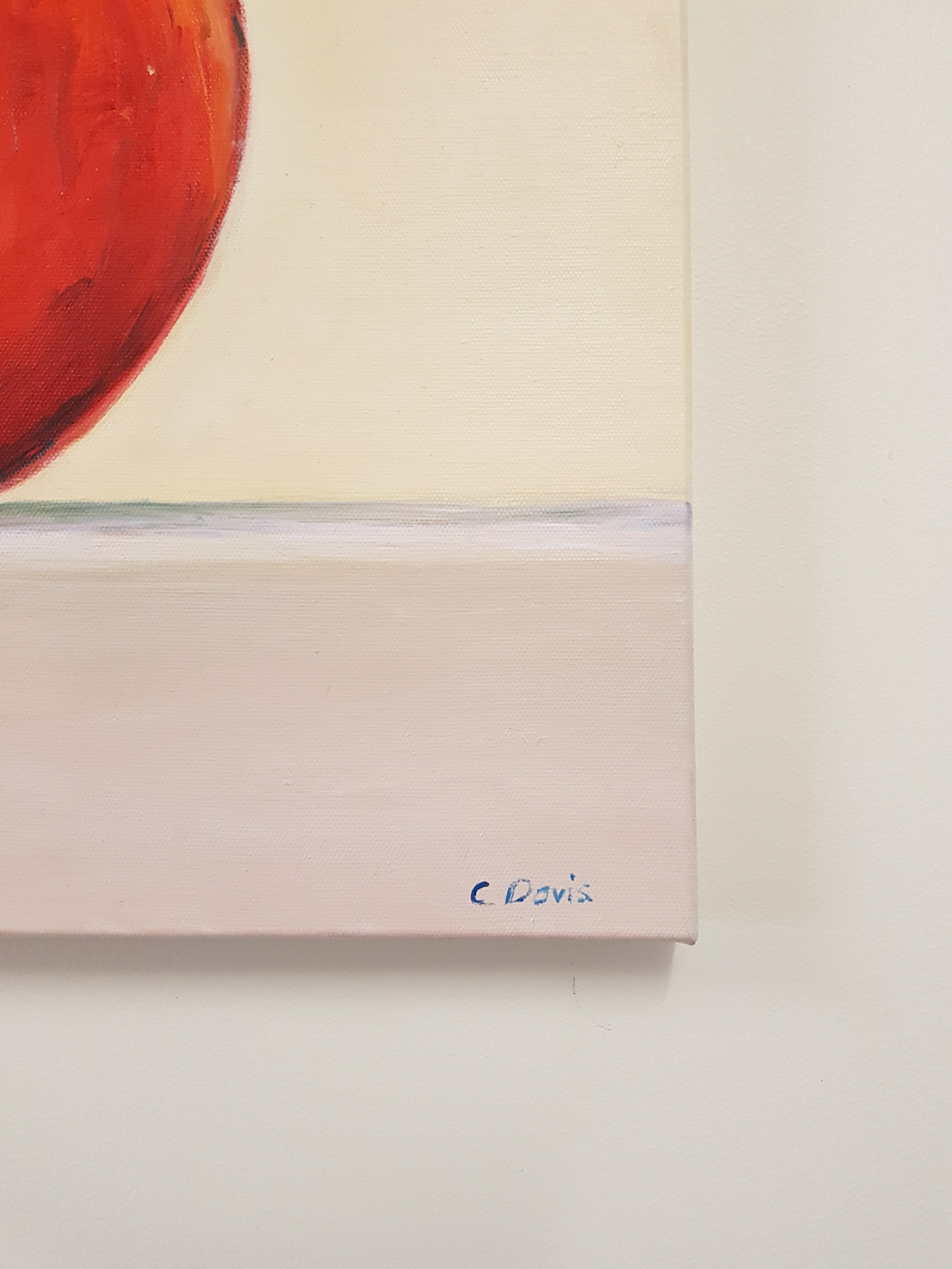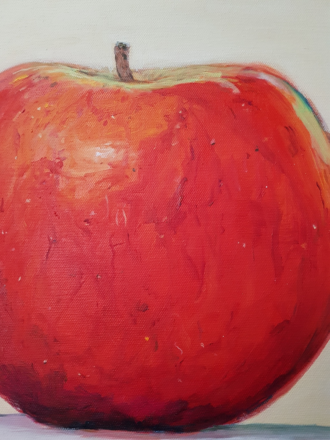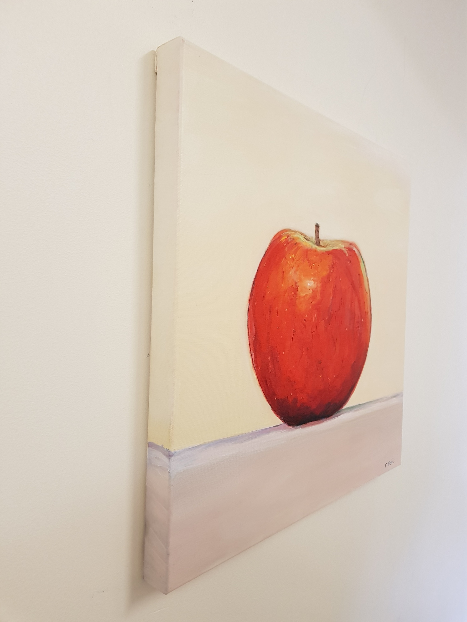 A still life oil painting on stretched canvas of a red apple on a shelf. The apple looks juicy and fresh by the layering of the oil paint. This painting was created at Splashout Studios where I have art classes and in my own studio. Students were to chose one fruit which will take up most of the canvas. I was attracted to the colors of reds, yellow and pink in this still life. This painting would look lovely in a kitchen or café environment.