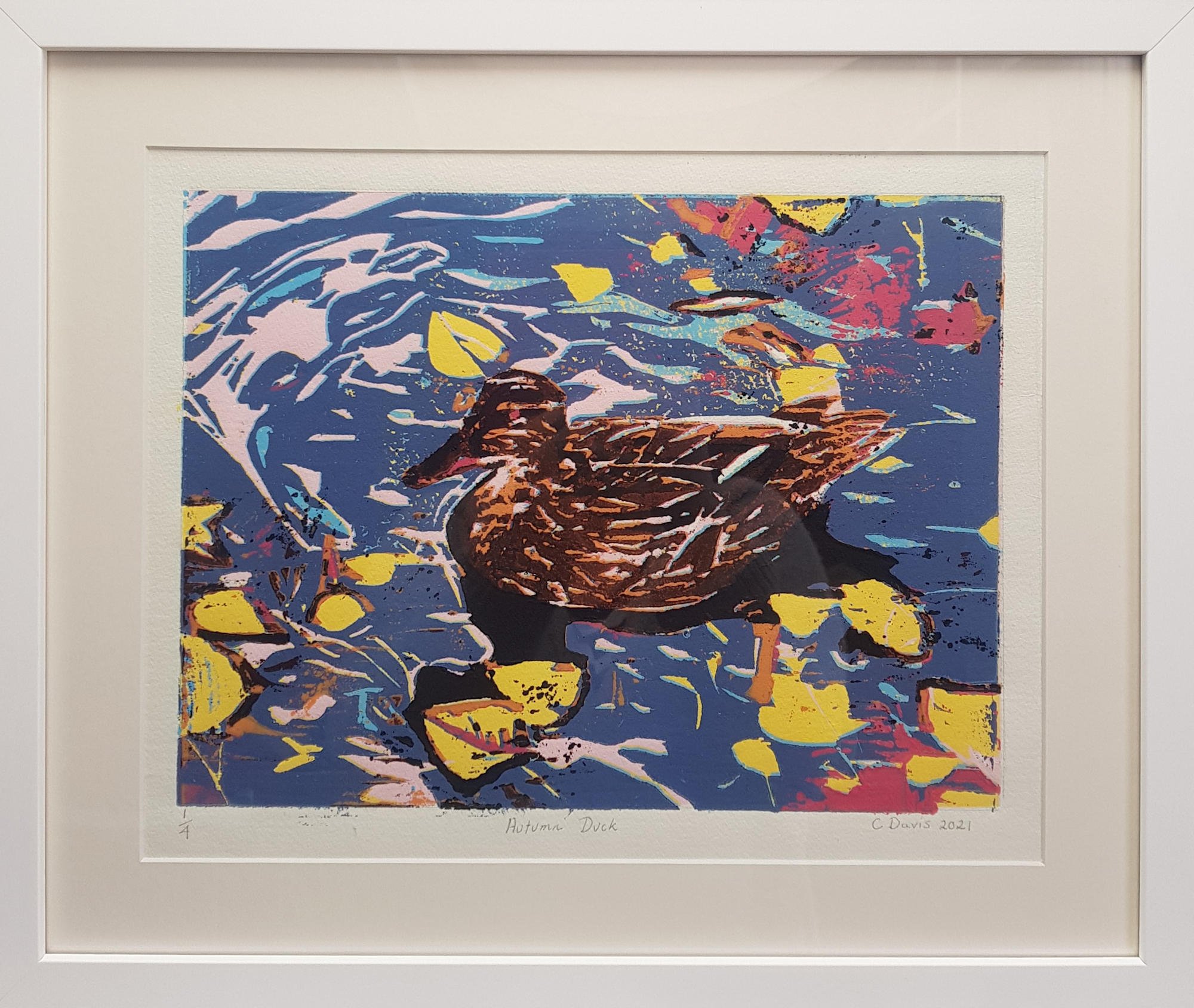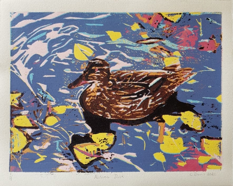 Autumn Duck is an eight-color reduction woodcut created from a reference photo. I purchased my own second-hand printing press from the art department at a secondary college. They were replacing it with a new one, but it works perfectly. I really enjoy the process and challenge of printmaking. I find watching ducks on the water soothing and meditative especially among autumn leaves.