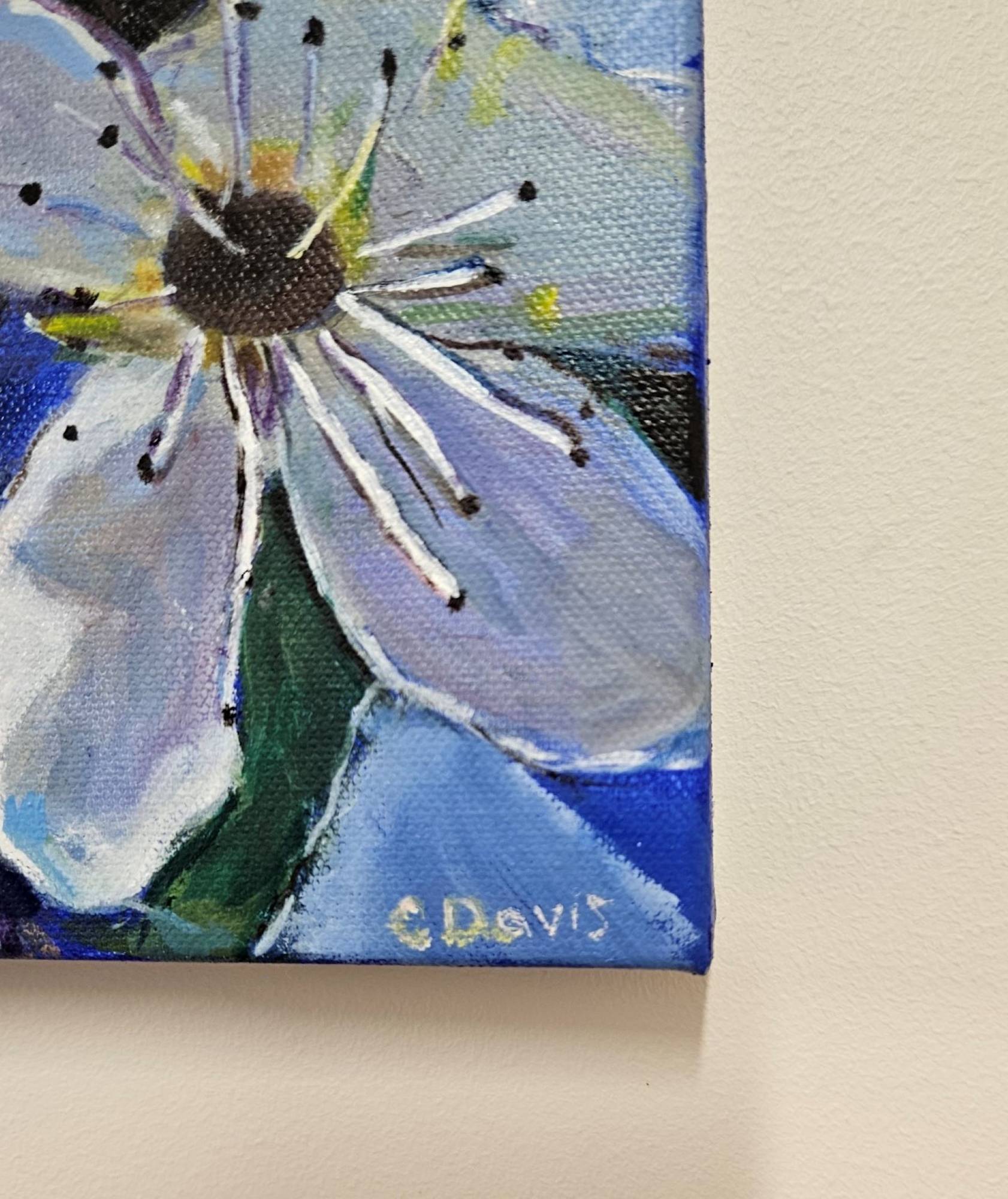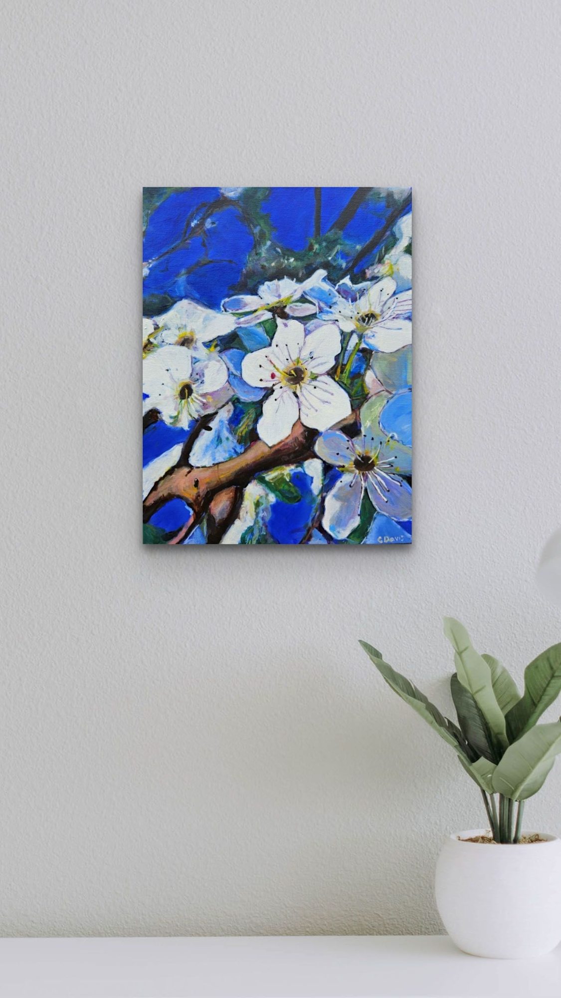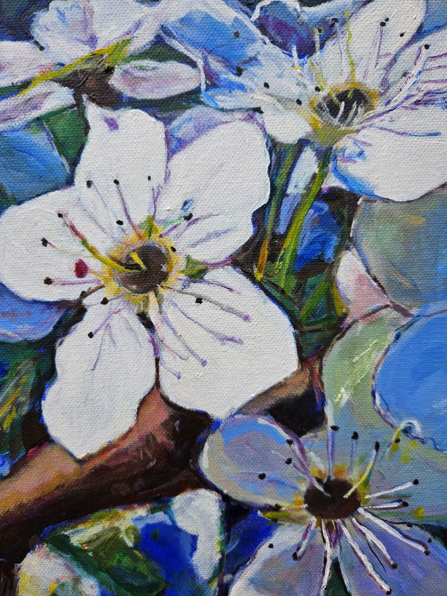 `Bloom` is a stunning portrayal of the beauty and fragility of nature in full bloom. The artist`s intention was to capture the essence of a moment in time when flowers are bursting with life and vitality, symbolizing new beginnings and growth. The use of vibrant colors, intricate details, and dynamic composition evokes a sense of awe and wonder at the natural world. The close-up perspective invites viewers to take a closer look at the delicate petals, leaves, and stems of the flowers, each brushstroke revealing the intricate beauty of the blooms. The artist`s careful attention to detail and use of light and shadow create a sense of depth and dimension, making the flowers come to life on the canvas. The choice of a deep blue background not only provides a striking contrast to the white blossoms but also symbolizes the vastness of nature and the limitless possibilities of growth and transformation. The red highlights in the center of the flowers add a touch of warmth and energy, emphasizing the vitality and vibrancy of the subject. Overall, `Bloom` is a captivating and mesmerizing piece of art that celebrates the beauty of nature and the fleeting moments of growth and renewal. It serves as a reminder to appreciate the simple yet profound beauty that surrounds us, encouraging viewers to pause and marvel at the wonders of the natural world.