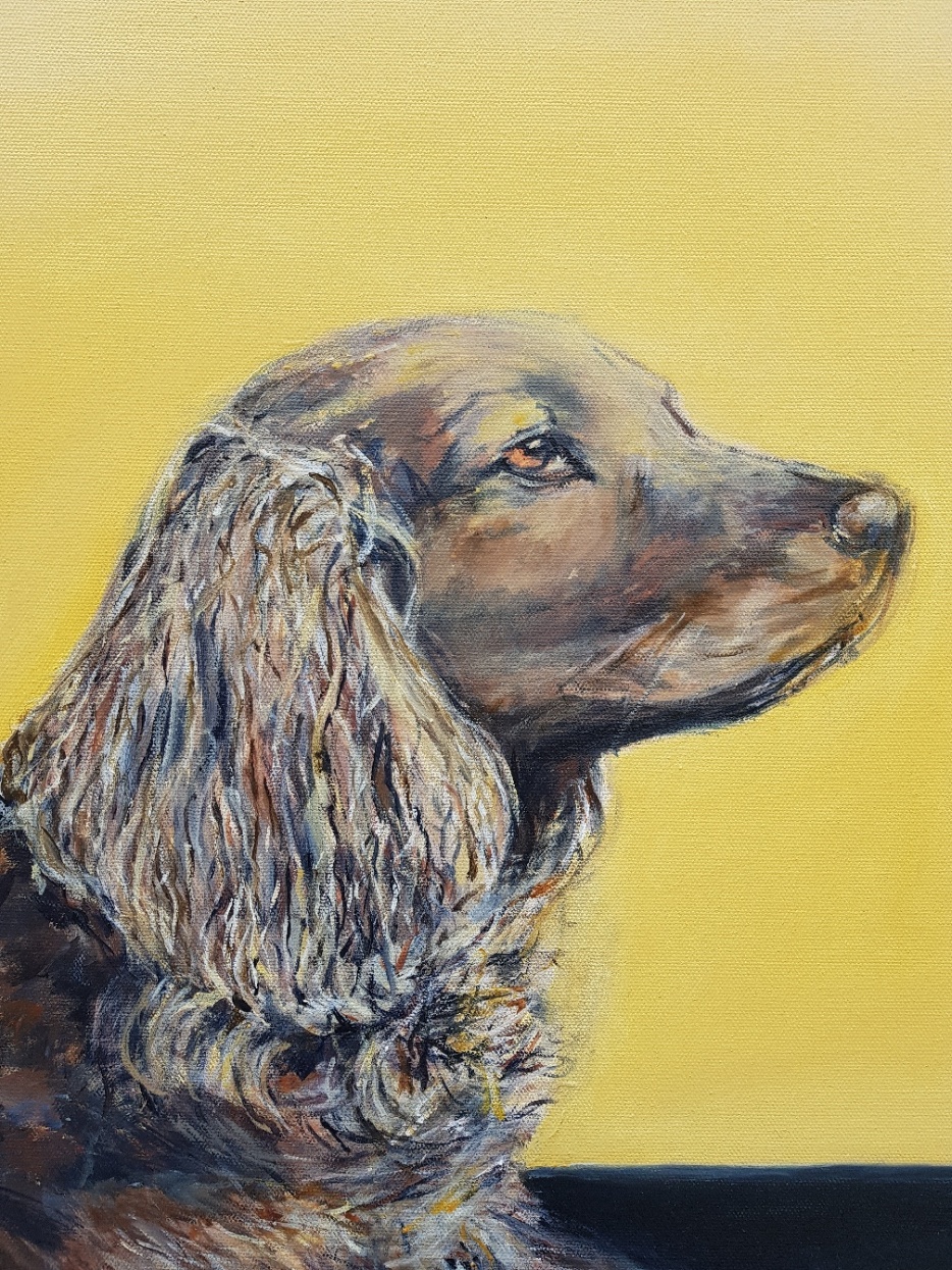 Oil painting on stretched canvas of a Golden Cocker Spaniel from a reference photo I chose at my weekly oil painting class at Splashout Art Studios. The Cocker Spaniel is my favourite breed of dog. This painting highlights the Spaniels soft floppy ears and friendly face.