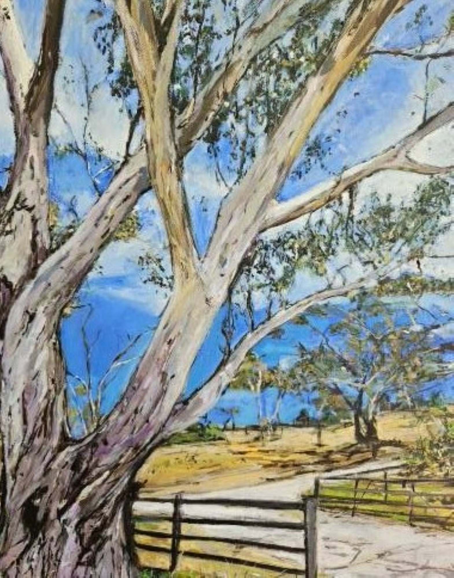 `Country Gateway` depicts a serene and welcoming scene in the Adelaide Hills countryside. The painting is centered around a rustic wooden gateway leading to a dirt track, nestled next to a majestic gum tree that towers over the landscape. The soft and earthy colors used in the palette convey a sense of warmth and tranquility, inviting the viewer to step into this peaceful rural setting. The artist`s intention with `Country Gateway` is to capture the essence of Australian country life, showcasing the simple beauty and charm of the countryside. The detailed brushstrokes and careful attention to light and shadow create a sense of depth and realism, drawing the viewer into the scene and allowing them to experience the tranquility and natural beauty of the environment. The composition of the painting focuses on the gateway as a symbolic entrance to the idyllic countryside, representing a sense of exploration and adventure. The gum tree standing tall and proud next to the gate serves as a reminder of the resilience and strength of nature, adding to the overall sense of harmony and balance in the scene. Overall, `Country Gateway` invites the viewer to pause and take a moment to appreciate the beauty of the natural world and the simple pleasures of rural life. It evokes a sense of peace and nostalgia, transporting the viewer to a simpler time and place where nature reigns supreme and the countryside beckons with endless possibilities for exploration and discovery.