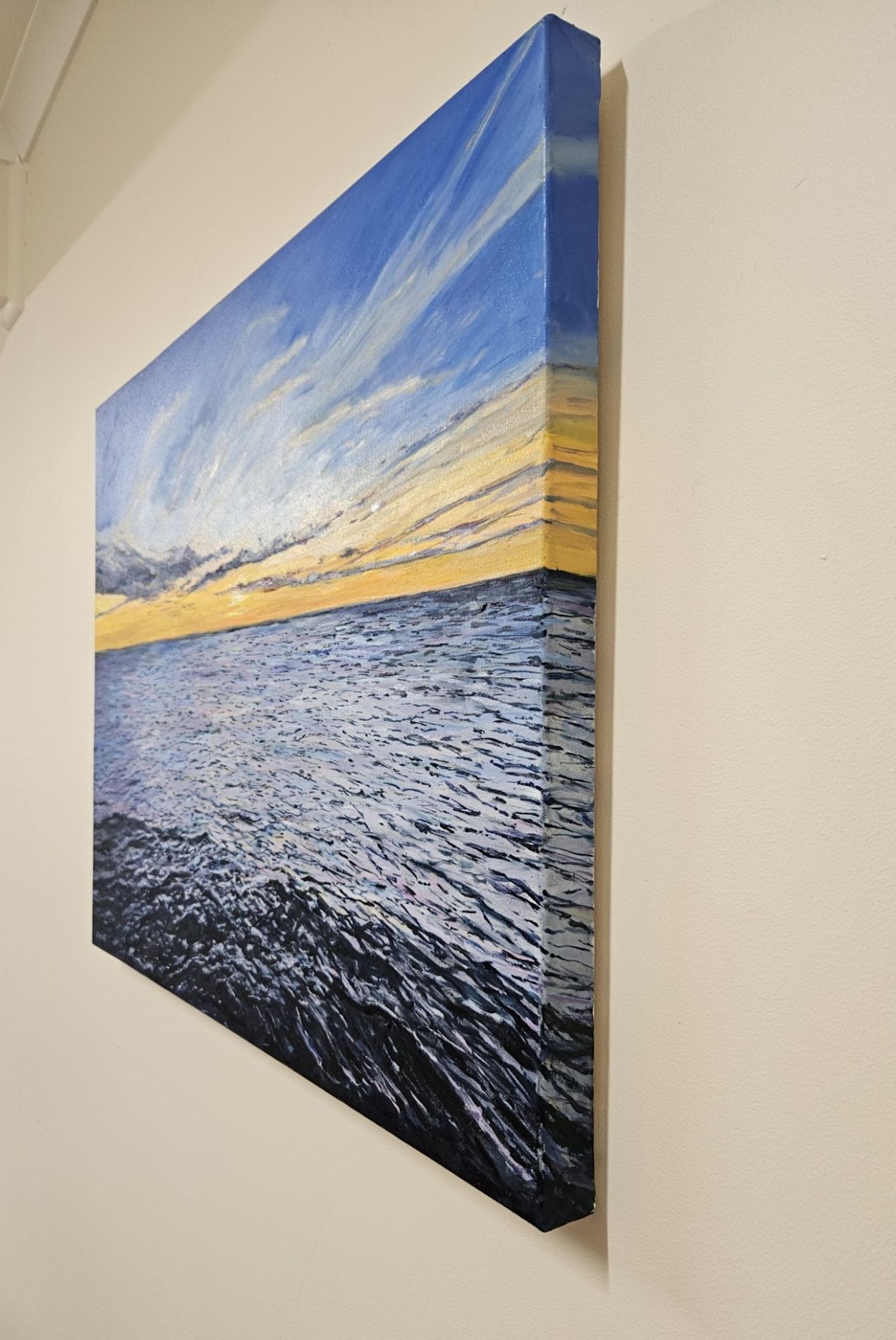 Engaging the viewer with a serene ocean scene, this piece presents the tranquil beauty of a sunset over calm waters. The painter employs delicate brushstrokes to create a soft, rippling texture on the water's surface, which reflects the evening light in shades of indigo and lavender. The sky above features layered clouds, subtly blending hues of deep blue and gentle yellow, leading to a golden horizon. This composition mirrors the serene, thoughtful state often sought in modern life, reminding us to find peace in clarity. The gentle gradient of colors and meticulous detailing guide the viewer through a soothing visual experience, encapsulating a peaceful end to the day.