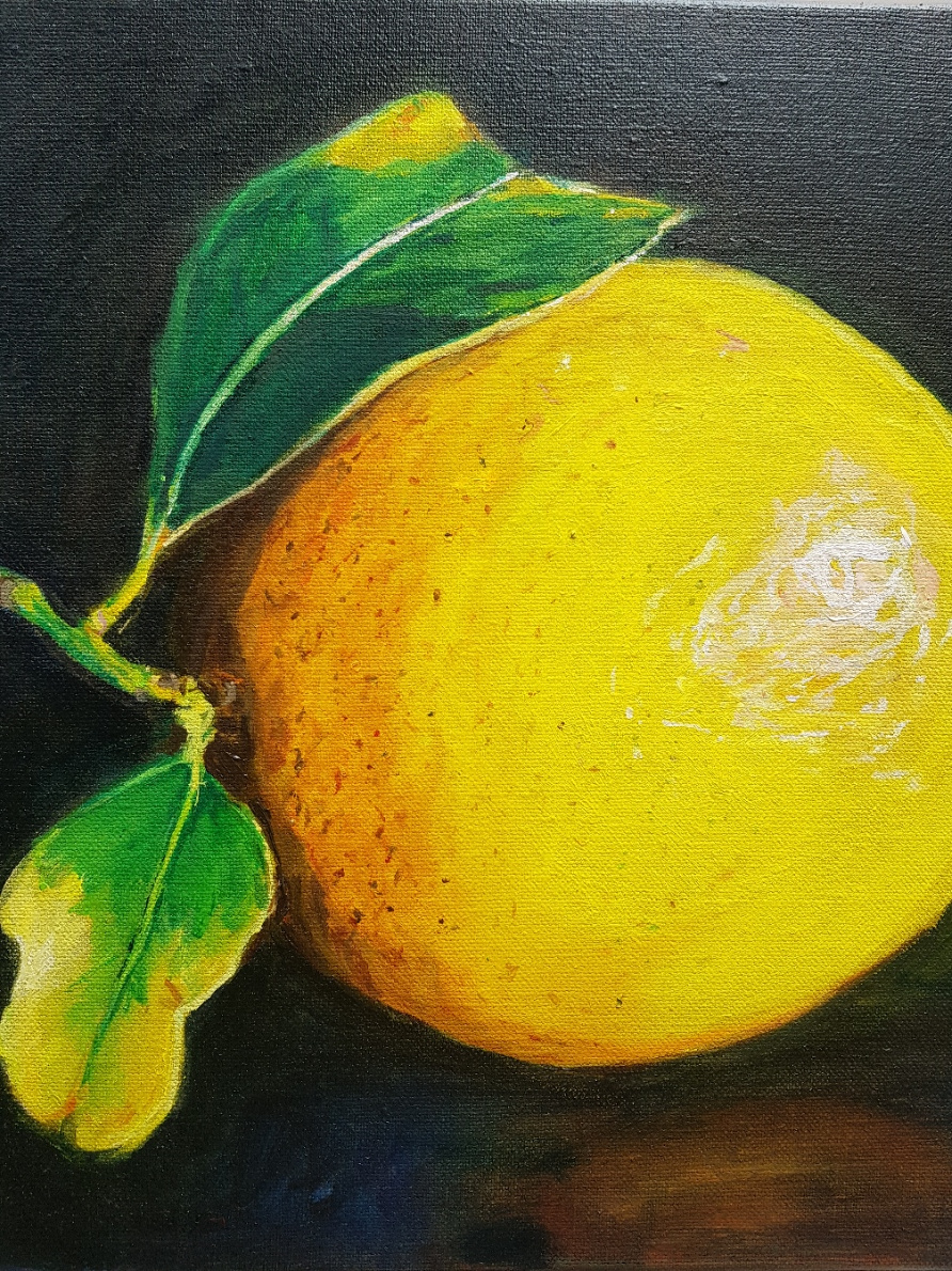 A detailed still life painting of a lemon in oil paint on a square stretched canvas.