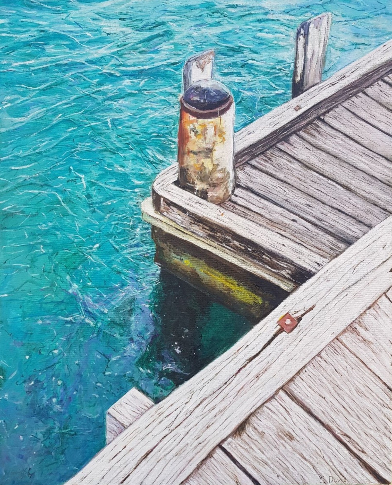 I took the reference photo for 'Love to be fishing' on the Altona Jetty, Melbourne. The jetty was built in the 1800s and unfortunately needs to be replaced because of its deterioration and public safety concerns. I think the weathered structure is a piece of art and contrasts well with the green waters below. I often think I would love to be fishing when walking on a jetty and wonder if there are many fish under the surface and if they are biting. It is mesmerising and calming to look at the water, watching shapes, ripples and patterns created .