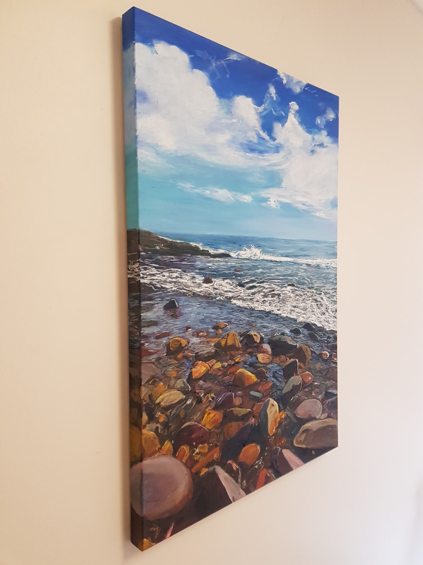 Marino Rocks no 2 is the second oil painting created from reference photos I took while standing on the rocks at Marino Rocks, a rocky beach of Adelaide. The rocks were wet showing off their colors on a bright sunny day. This painting is part of a series of seascapes I am creating from photos captured along the Adelaide and Fleurieu Peninsula coastline of South Australia. They will be exhibited from the 10th June to the 3rd of July at Gallery M, Marion.