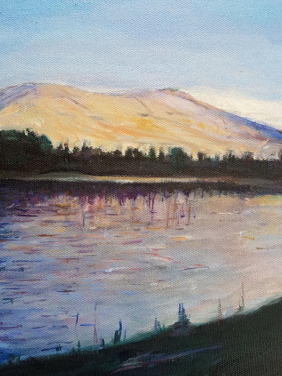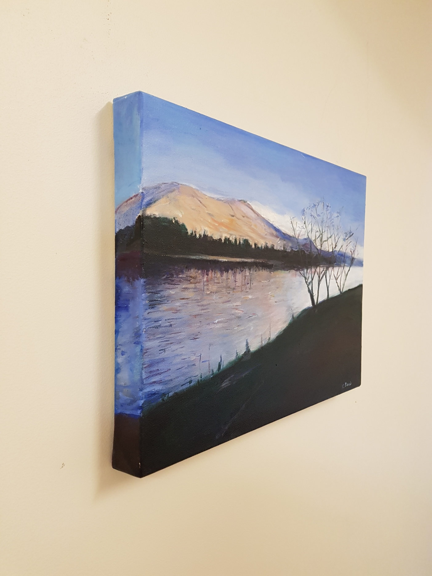 'Night lake' was created from a reference photo given at the Splashout Art School, Marino Rocks, Adelaide. The painting was started by a black and white tonal study and then adding layers of colour. The scene is at night with a dark foreground and silhouette of trees. The lake and sky is a gorgeous cool blue with reflections from the mountain in the water. White clouds are rising up from behind the mountain.