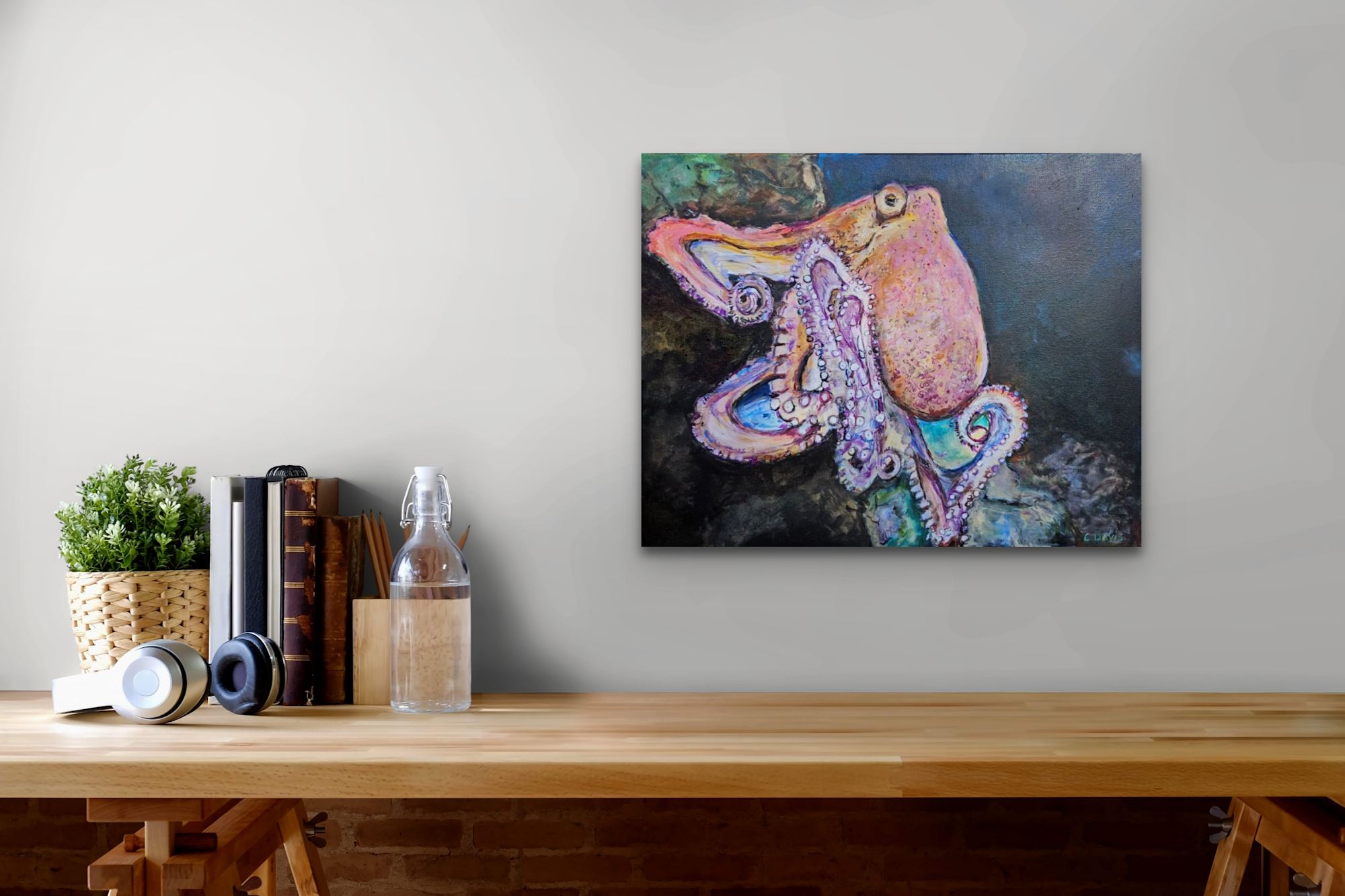 When I found the octopus reference photo for this artwork, I knew I wanted the challenge of creating a 3D effect of tentacles and body against a dark background. The background compliments the octopus bright colour and contrasts against its light tentacles. The octopus is an amazing , beautiful and fascinating ocean creature.