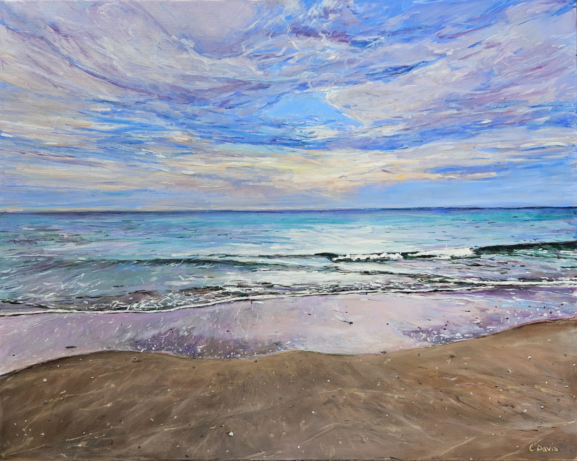 `Pastel Coastal Landscape` is a mesmerizing artwork that transports the viewer to a peaceful coastal landscape. The artist has captured the essence of a calm morning by the sea, where the gentle waves whisper to the shore under a vast and cloudy sky. The use of soft, pastel colors creates a dreamlike atmosphere, inviting the viewer to immerse themselves in the tranquility of the scene. The sky dominates the upper portion of the canvas, with its gradient of blues and purples blending seamlessly into each other. Wispy clouds drift lazily across the sky, catching the first light of dawn and casting a warm, golden glow over the entire scene. The sea is a serene expanse of turquoise and teal, its surface reflecting the colors of the sky above. The water ripples gently, creating a sense of movement and life in the otherwise still landscape. The shoreline is a narrow band of sand that separates the sea from the sky, painted with warm browns and ochres that suggest the warmth of the early morning sun. The sand is textured with tiny details that hint at the presence of shells and grains of sand, adding a touch of realism to the otherwise ethereal scene. The composition is carefully balanced, with the horizon line serving as a dividing point between the spacious sky above and the grounded sea below. Overall, `Early morning on the beach` is a tranquil and serene artwork that speaks to the beauty and peacefulness of nature. The artist`s skilled use of visual elements such as color, light, and composition create a sense of harmony and tranquility that invites the viewer to escape into this idyllic coastal landscape and find a moment of peace and serenity.
