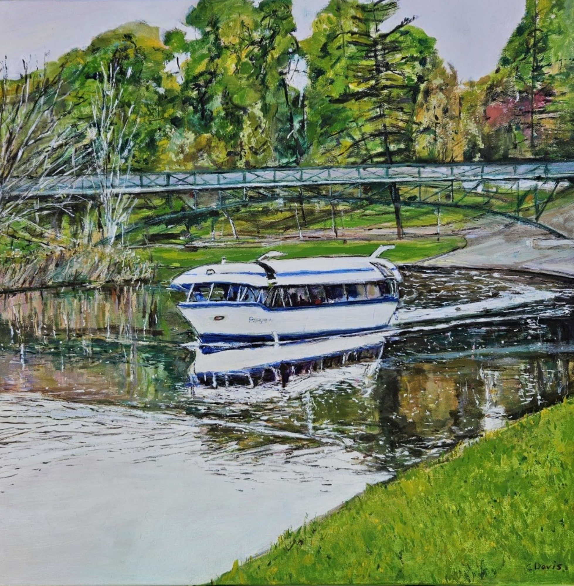 Popeye River Cruise depicts the iconic Popeye boat cruising along the picturesque River Torrens in Adelaide. The vibrant oil colors bring to life the bustling atmosphere of this popular tourist attraction. The painting captures the essence of leisure and relaxation as the boat smoothly glides through the calm waters, surrounded by lush greenery and the city skyline in the background. The Popeye boat itself is prominently featured in the center of the composition. The boat`s cheerful design brings a sense of nostalgia and whimsy, evoking memories of childhood adventures and carefree moments spent cruising along the river. The surrounding landscape is beautifully rendered, with the trees swaying gently in the breeze and the city buildings towering in the distance. The artist has paid attention to detail, capturing the reflections of the sunlight on the water and the play of shadows on the riverbank, creating a sense of depth and dimension in the painting. Overall, Popeye River Cruise is a celebration of nature, relaxation, and the joy of exploration. It invites the viewer to step on board the Popeye boat and immerse themselves in the tranquility of the river, allowing them to escape from the hustle and bustle of everyday life and experience a moment of peace and serenity.