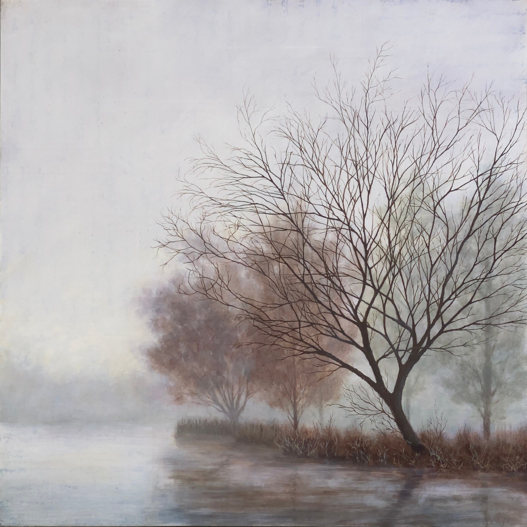 Located on Green Lake in Seattle, based on an image from one of my stand-up paddleboard outings. Being ON the lake vs. on the path NEXT to the lake is an entirely different experience and perspective; it was a balm for me during the pandemic, when the paths were full but the lake was empty. It was like stepping into another world, so peaceful, especially during the foggy mornings in fall. Collage pieces are from the Japanese Noh play entitled “Matsukaze”; I have a fun story to tell you about it if you’re interested—next time I see you.