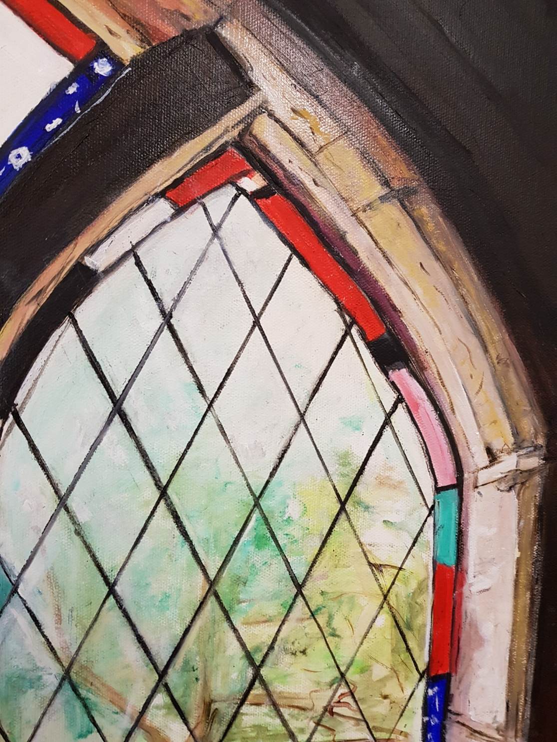 Stained glass window in Montsalvat is a painting from a reference photo I took when visiting Montsalvat, Eltham, Victoria. This painting captures the light shining through the window onto the window sill of the dark room of the Montsalvat building. The colours in the stained glass window are brightened from the sunlight.