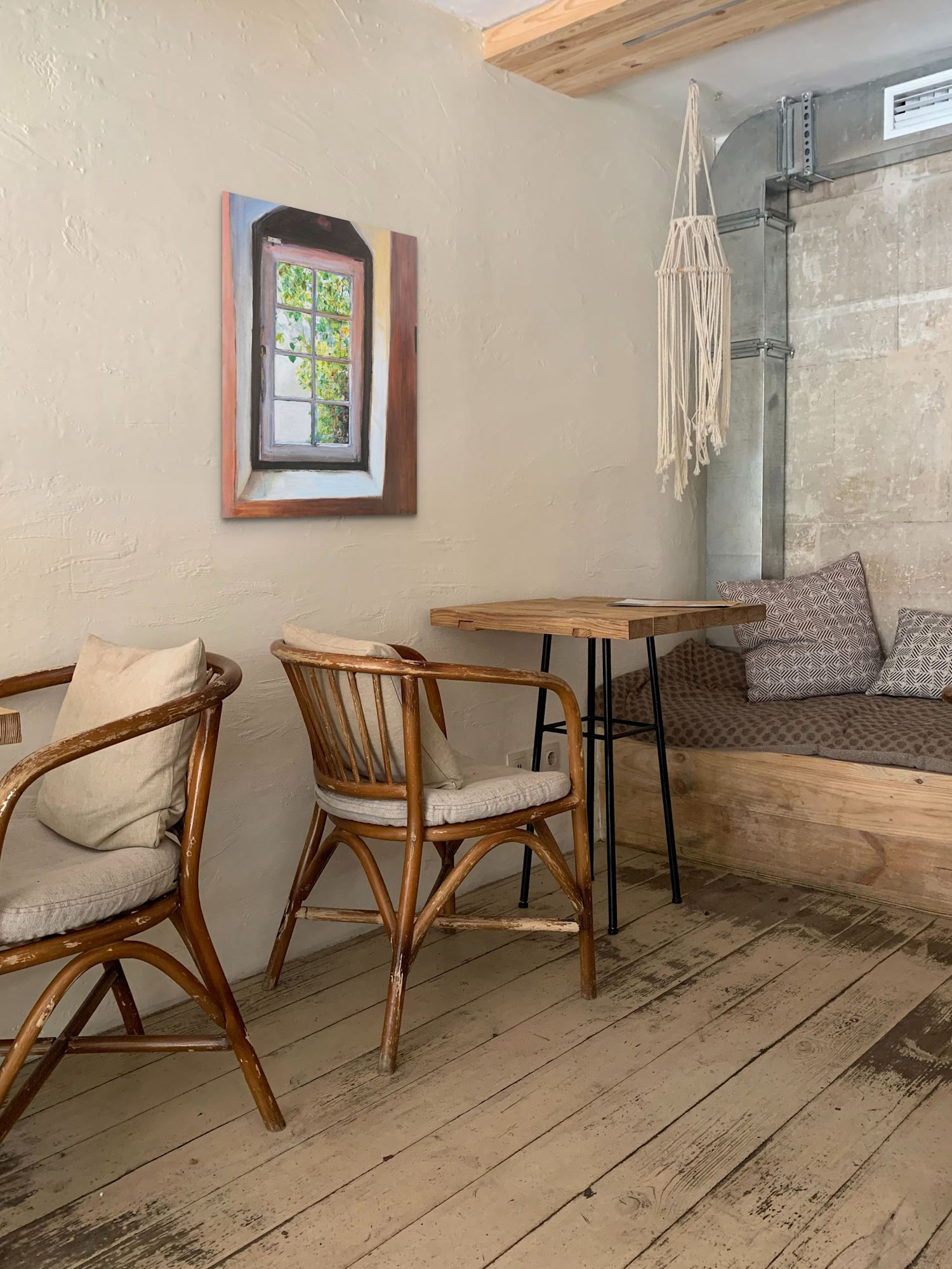 The artwork `Window` captures a moment of tranquility and serenity, inviting the viewer to escape into a lush and vibrant landscape. The realistic depiction of a window, divided into multiple panes, creates a sense of depth and perspective. The contrast between the light streaming in through the window and the shadows cast on the wall adds a layer of complexity to the composition. The color palette of light browns, vibrant greens, and whites creates a harmonious and soothing atmosphere, evoking a feeling of peace and calm. The artist`s intention in creating this piece was to transport the viewer to a greener and more peaceful world, offering a moment of respite from the chaos of everyday life. The window serves as a frame, drawing the viewer`s gaze outwards towards the natural beauty beyond. The texture of the brushstrokes adds a sense of movement and life to the painting, further immersing the viewer in the scene. Overall, `Window` is a contemplative and introspective artwork that celebrates the beauty of nature and the simple joys of looking out onto a tranquil landscape. It serves as a reminder to pause, breathe, and appreciate the beauty that surrounds us, even in the most ordinary of places like a window on a sunny day.
