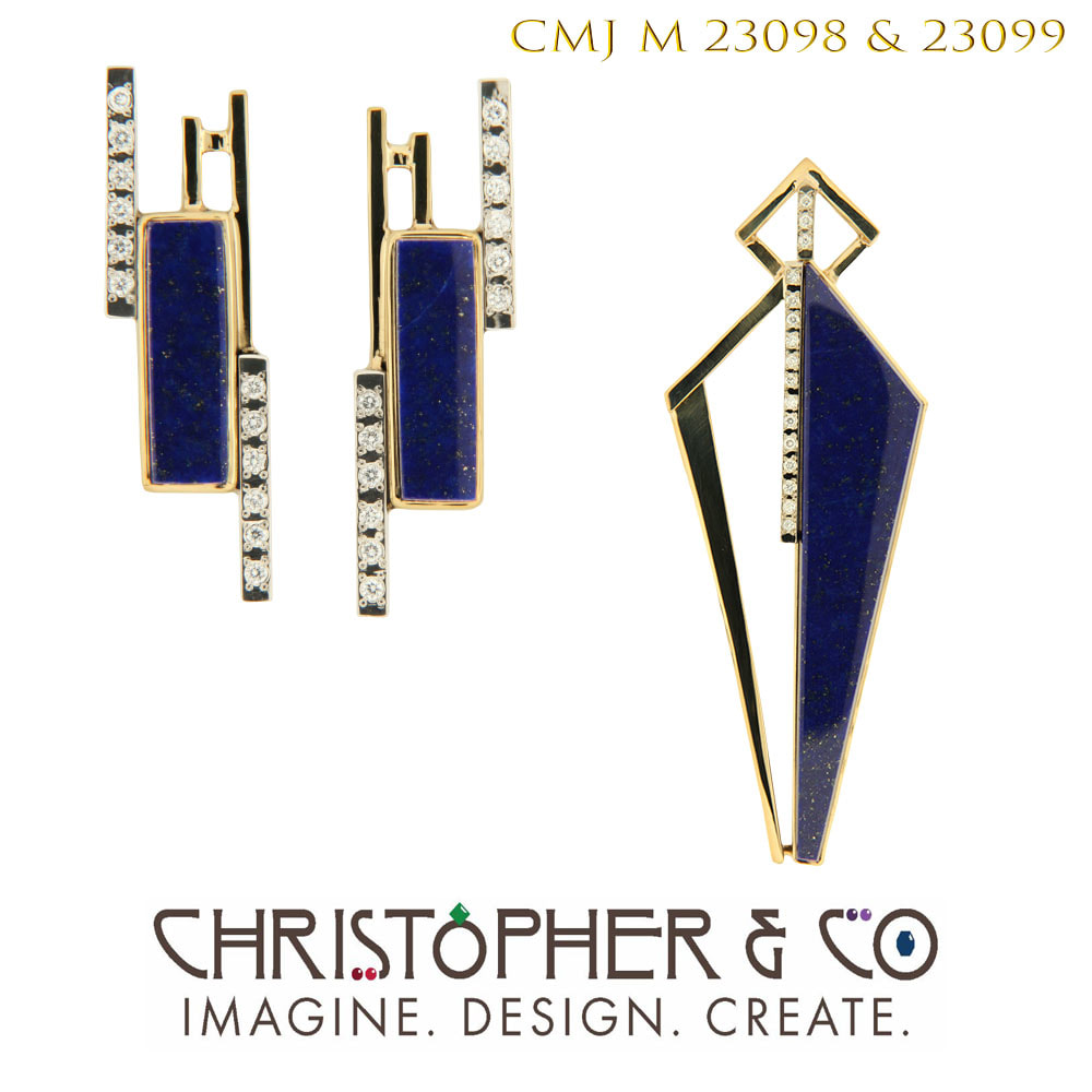 CMJ 23098 & 23099 Gold pendant and earrings by Christopher M. Jupp set with diamonds and lapis lazuli.
