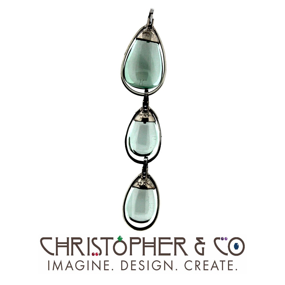 One pair of 14 karat white gold earrings and one pendant designed and handcrafted by Christopher M. Jupp. The earrings are set with one pair of green quartz which have a total weight of 9.81 carats and were hand carved by Sherris Cottier-Shank. The pendant is set with one 12.62 carat green quartz which was also hand carved by Sherris Cottier-Shank.