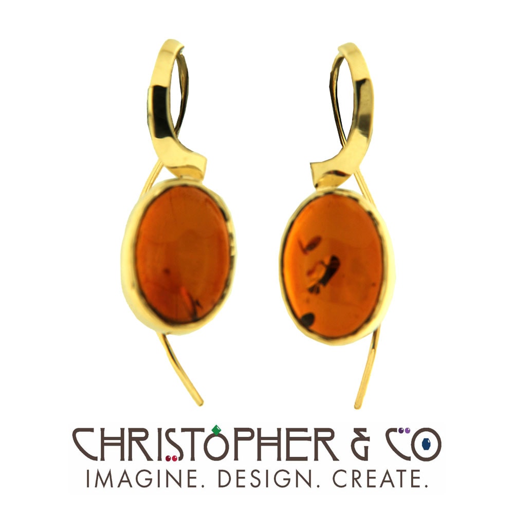 One pair of 14 karat yellow gold earrings designed by Christopher M. Jupp. The earrings are set with a pair of amber cabochons which were provided by the customer.