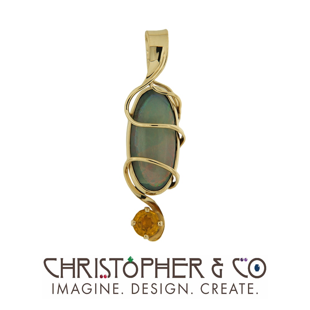 On 14 karat yellow gold pendant designed by Christopher M. Jupp. The pendant is set with one opal cabochon and one yellow faceted citrine.
