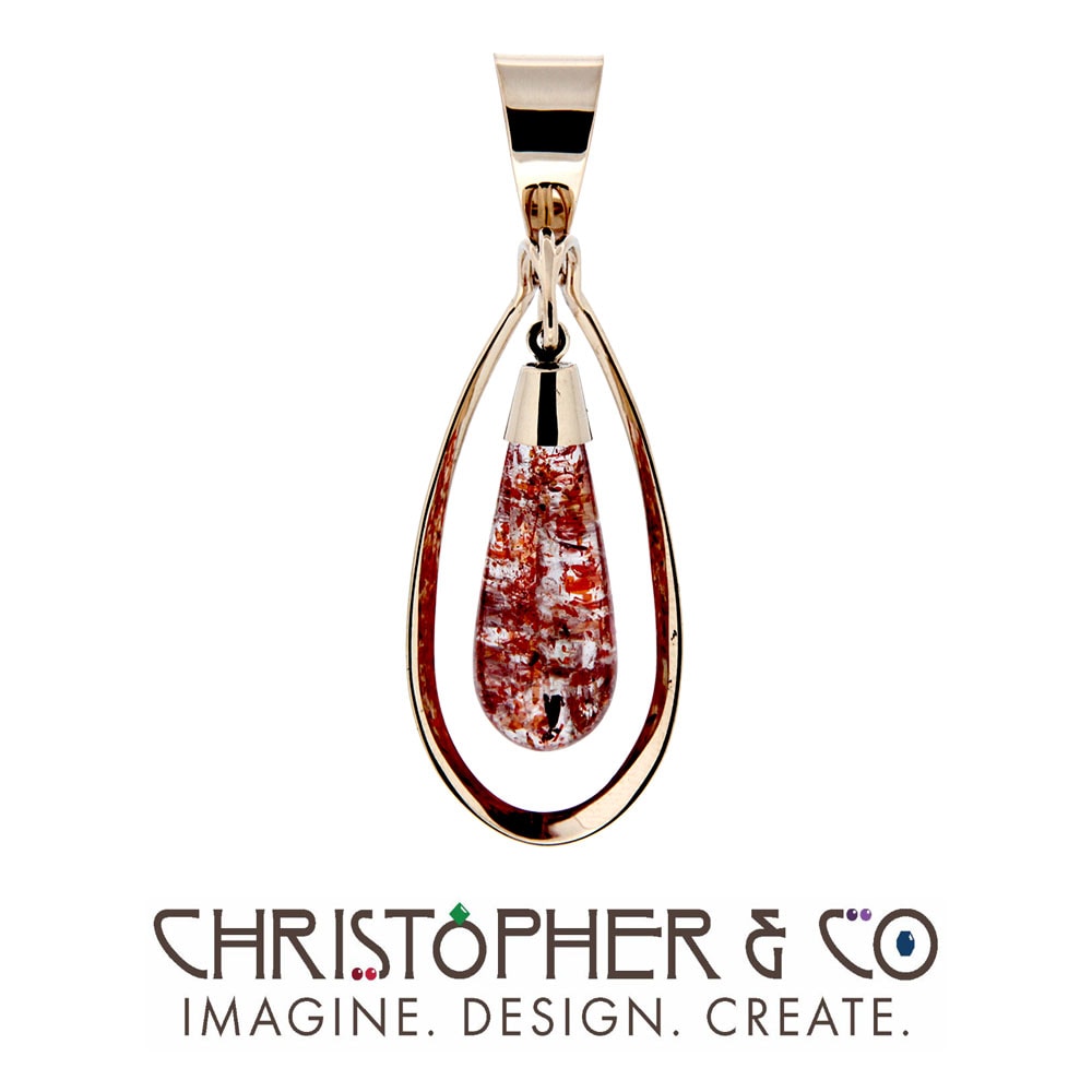 One 14 karat yellow gold pendant designed and hand crafted by Christopher M. Jupp. The pendant is set with one 11.16 carat sunstone.