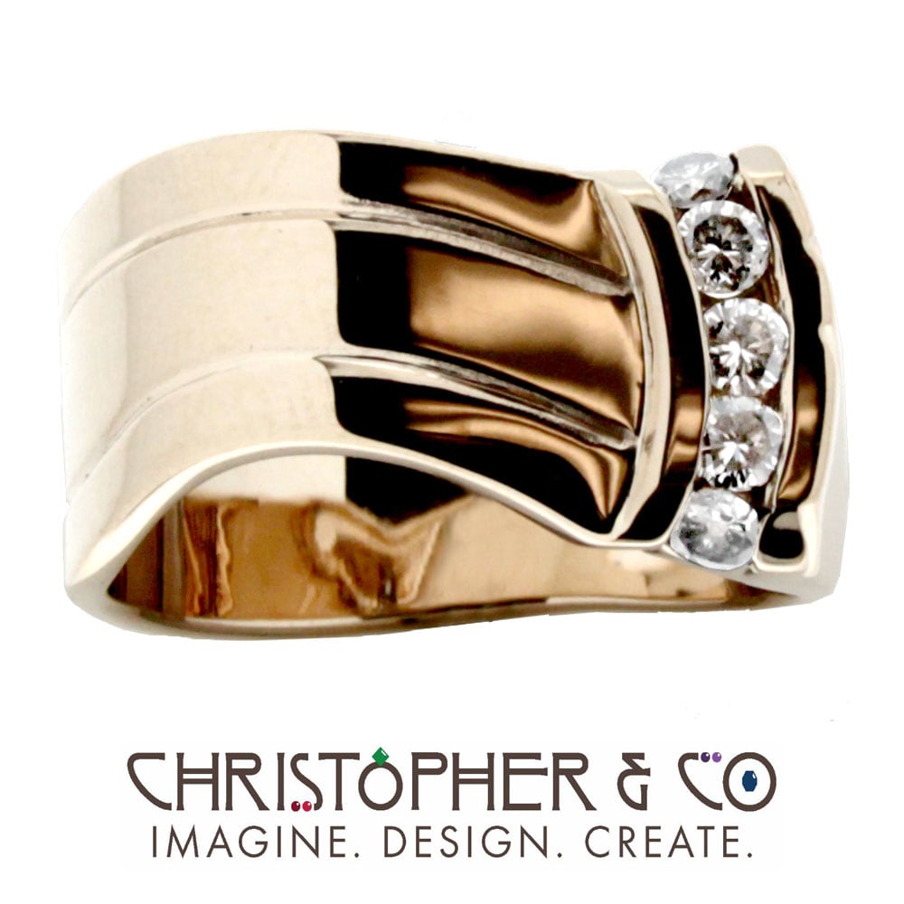 One 14 karat yellow gold ring designed and hand crafted by Christopher M. Jupp. This ring is set with five diamonds provided by the customer. The five round brilliant cut diamonds have a total weight of .50 carats. One diamond is chipped. These diamonds are H in color and SI2 to I1 in clarity.