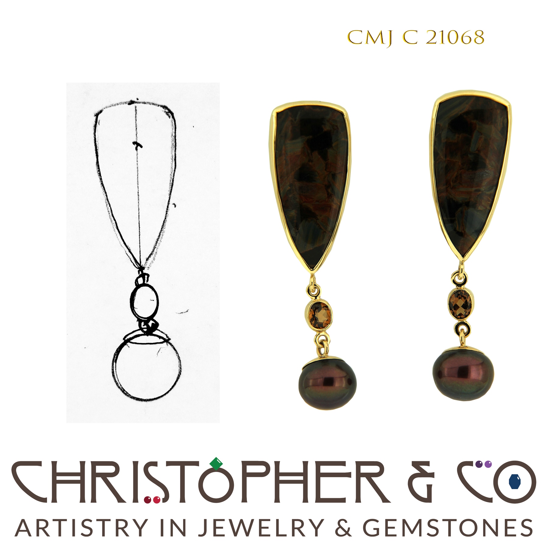 14 karat yellow gold earring pair designed by Christopher M. Jupp. The earrings are set with pietersite, faceted zircon and pearls