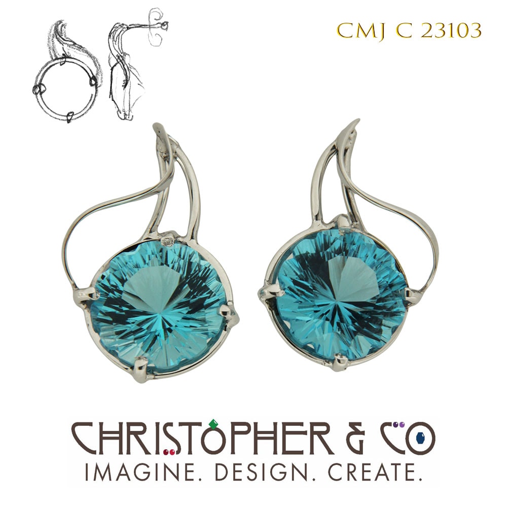 One pair of 14 karat white gold earrings by Christopher M. Jupp. The earrings are set with a pair of Swiss Blue Topaz dodeca floral cut hand faceted by Richard Homer weighing 6.22 carats total.