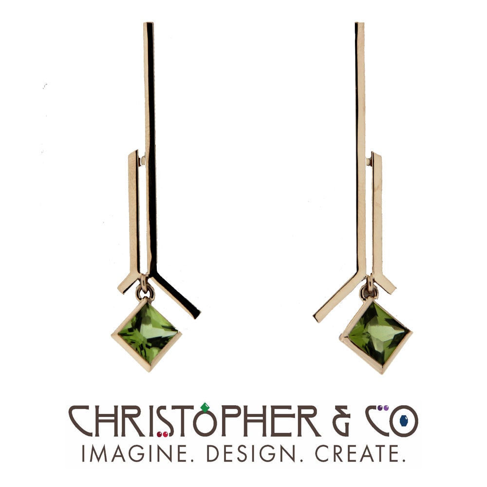One pair of 14 karat yellow gold earrings designed and handcrafted by Christopher M. Jupp. These earrings are set with one pair of 3.47 carat Peridot quadrillion cut.