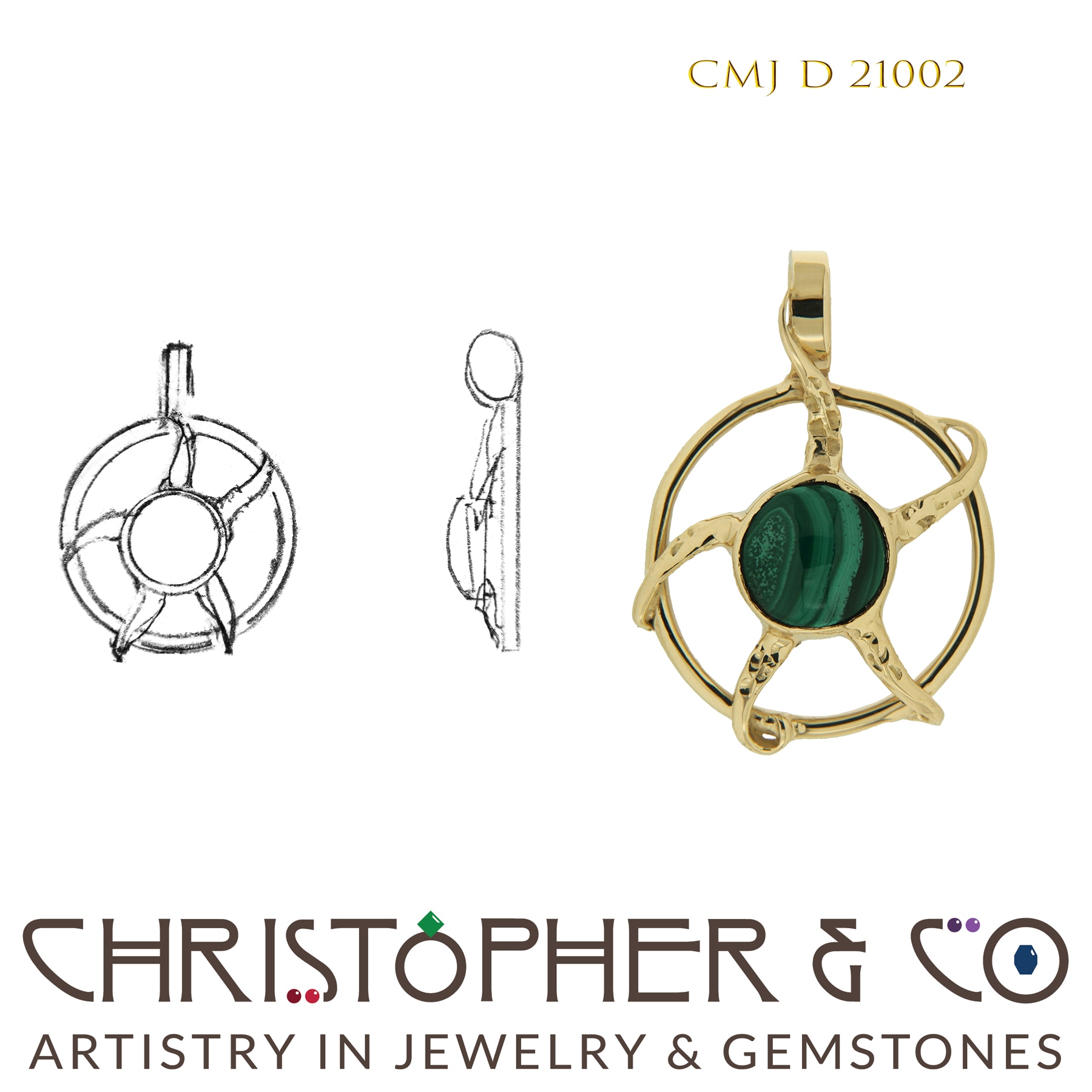 14 karat yellow gold pendant designed by Christopher M. Jupp. The pendant is set with one malachite cabachon.