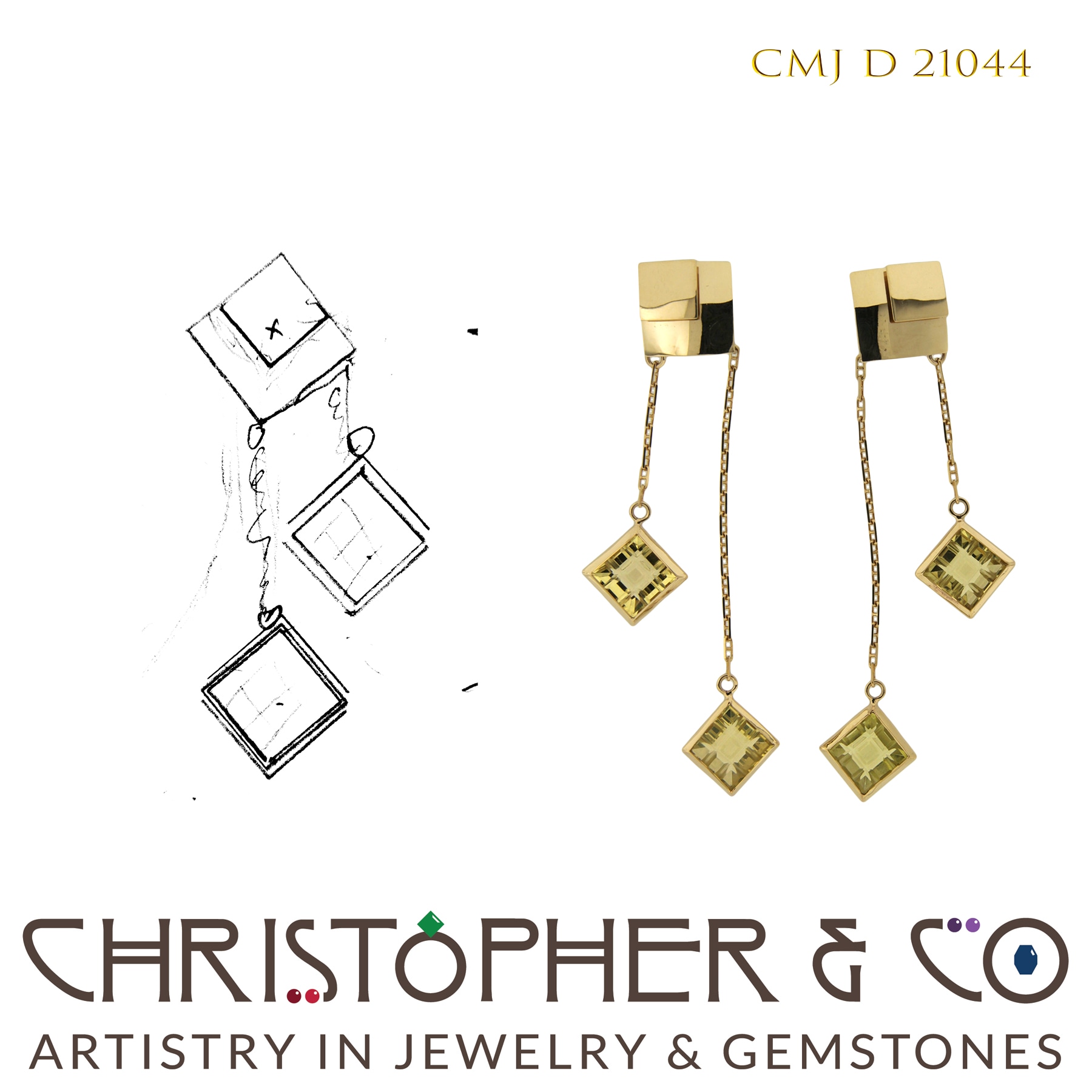 One pair of 14 karat yellow gold earrings designed by Christopher M. Jupp. The earrings are set with a group of four lemon citrine carved criss cross tablets hand cut by Richard Homer.
