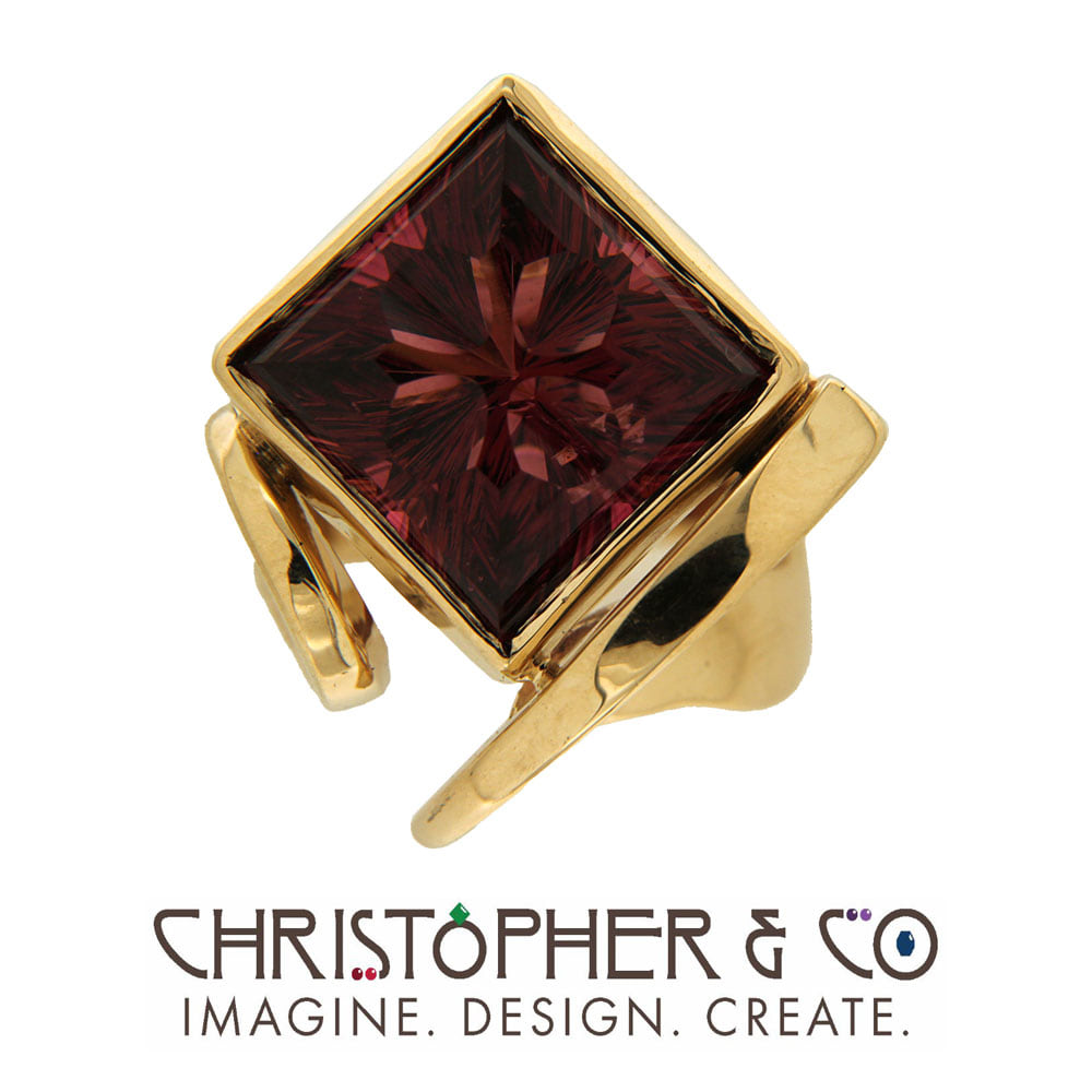 One 14 karat yellow gold ring designed by Christopher M. Jupp. The ring is set with one 14.45 carat square maltese concave brilliant cut, 14 X 14 X 10.4 mm rubellite tourmaline hand cut by Richard Homer. The tourmaline has the registry # 4947.