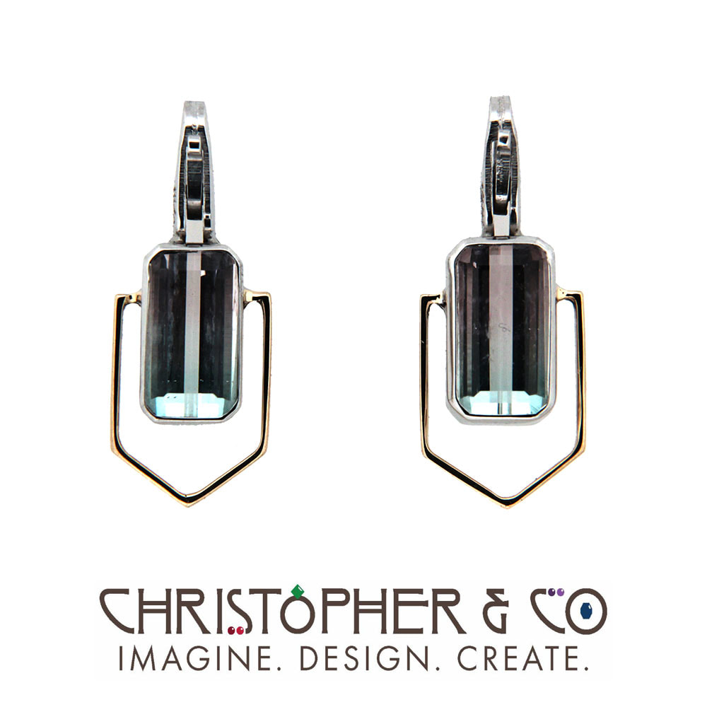 Two 14 karat yellow and white gold elements designed and handcrafted by Christopher M. Jupp. These elements are set with one pair of Afghani Bicolor Tourmalines with a total carat weight of 3.13.