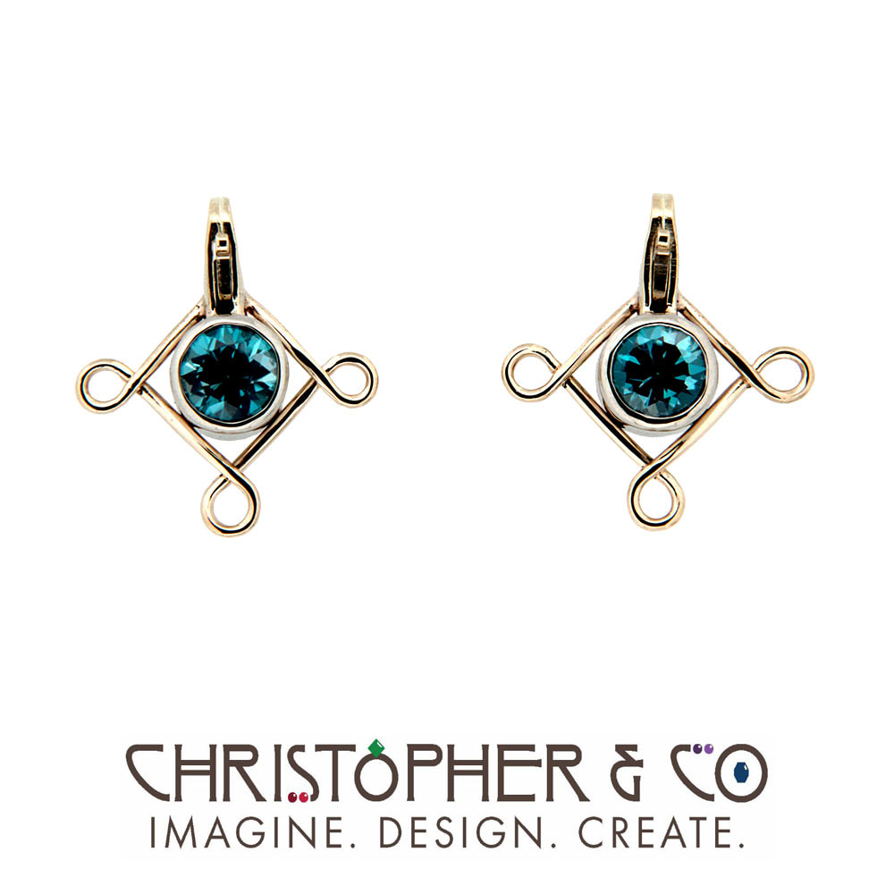 Two 14 karat yellow and white gold elements designed and handcrafted by Christopher M. Jupp. These elements are set with one pair of Cambodian blue zircon with a total weight of 2.01 carats.