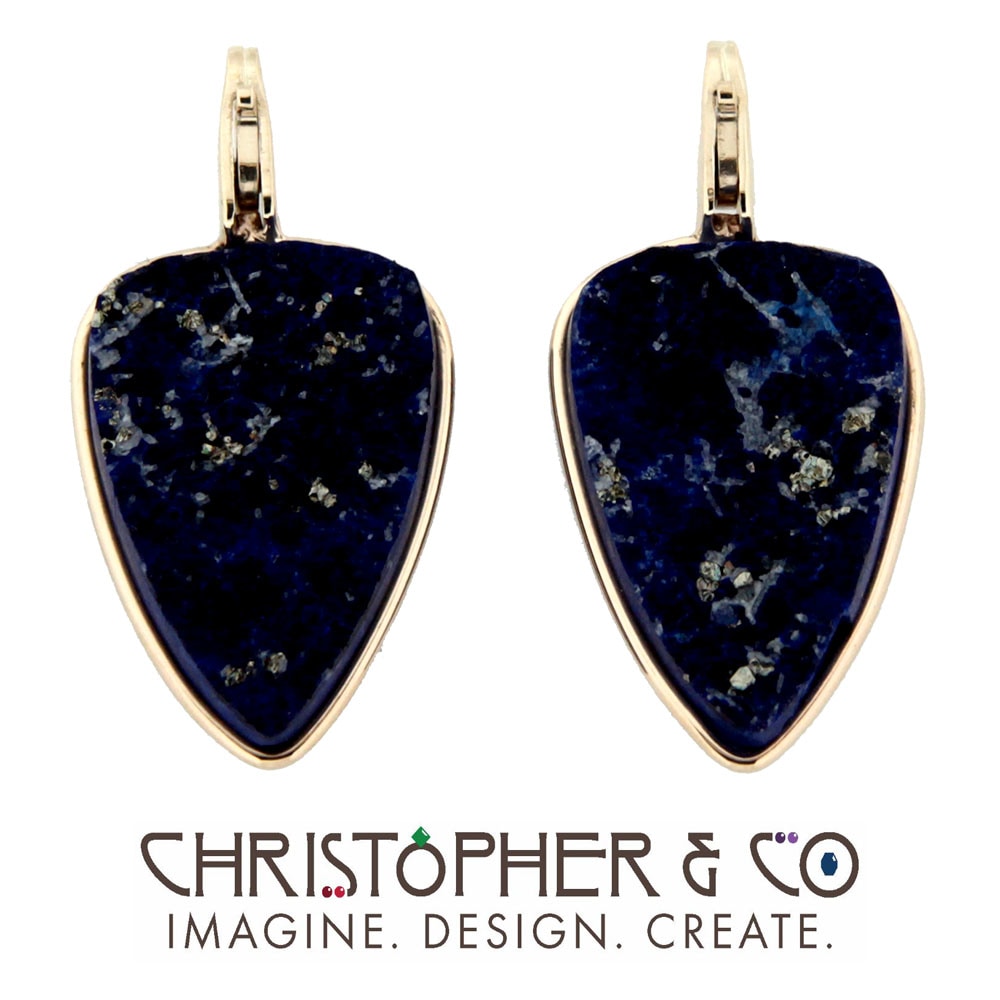One pair of 14 karat yellow gold elements designed and handcrafted by Christopher M. Jupp. These elements are set with two 17.25 carat Lapis Lazuli.