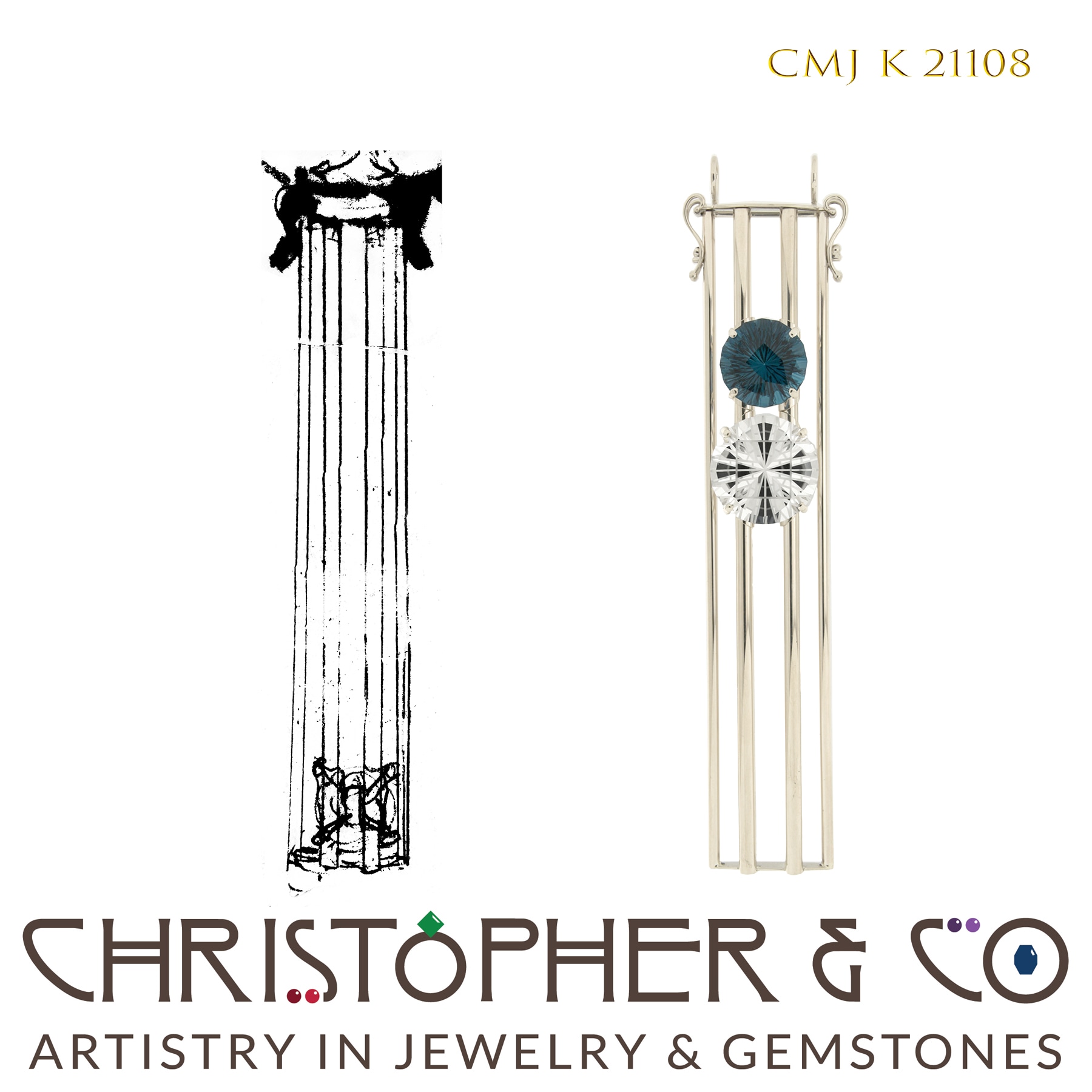 One 14 karat white gold pendant designed by Christopher M. Jupp. The pendant is set with one “sapphire blue” concave cut topaz and one silver concave cut topaz. Both gems were hand-cut by Richard Homer.