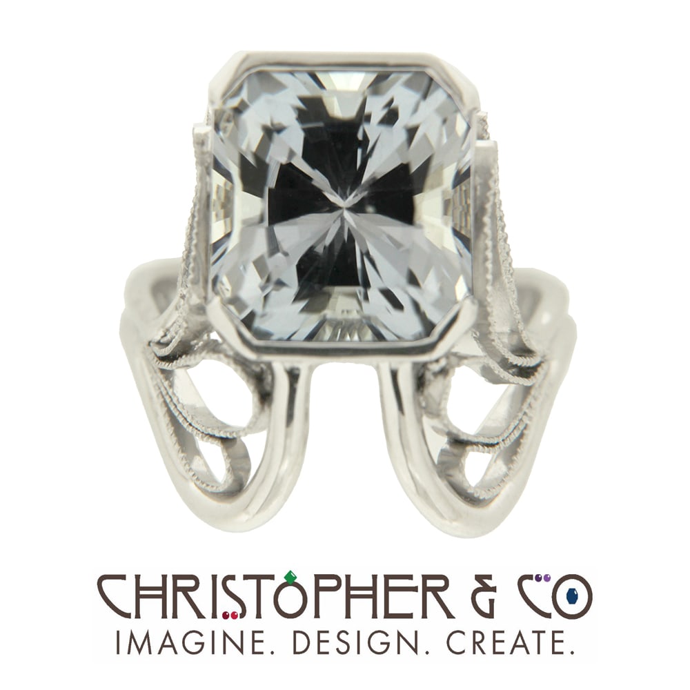 One 14 karat white gold ring designed by Christopher M. Jupp. The ring is set with one 6.96 carat violetrine. The violetrine was hand faceted by Darryl Alexander.