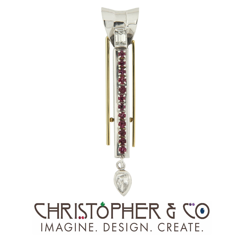 One 14 karat yellow and white gold pendant designed by Christopher M. Jupp. The pendant is set with one pear shape faceted diamond, one emerald cut diamond and twelve round faceted rubies. All gemstones were supplied by the customer.