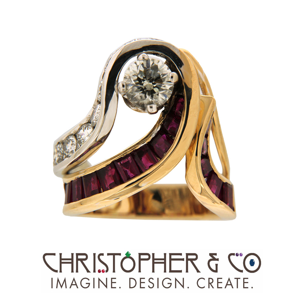 One 14 karat yellow and white gold ring designed by Christopher M. Jupp. The ring is channel set with fourteen (14) emerald cut very fine rubies (one of which is chipped on the corner) weighing 2.80 carats total. The ring is also channel set with ten (10) brilliant cut diamonds with a total weight of .88 carats, G/H color and SI2/SI3 clarity. The ring is also set with one brilliant cut diamond with a weight of +/- .85 carats is L in color and VS2 in clarity.