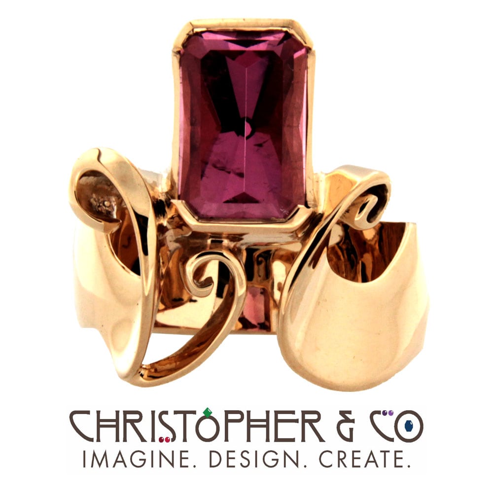 One 14 karat yellow gold ring designed and hand crafted by Christopher M. Jupp. The ring is set with one 4.93 carat pink tourmaline