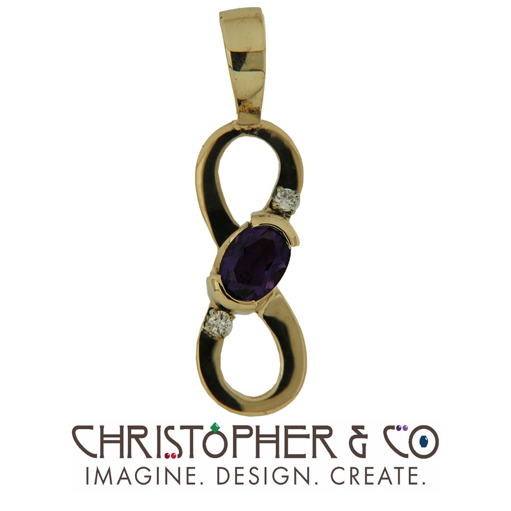 One 14 karat yellow gold pendant designed by Christopher M. Jupp. The pendant is set with an oval faceted amethyst and two brilliant cut diamonds.