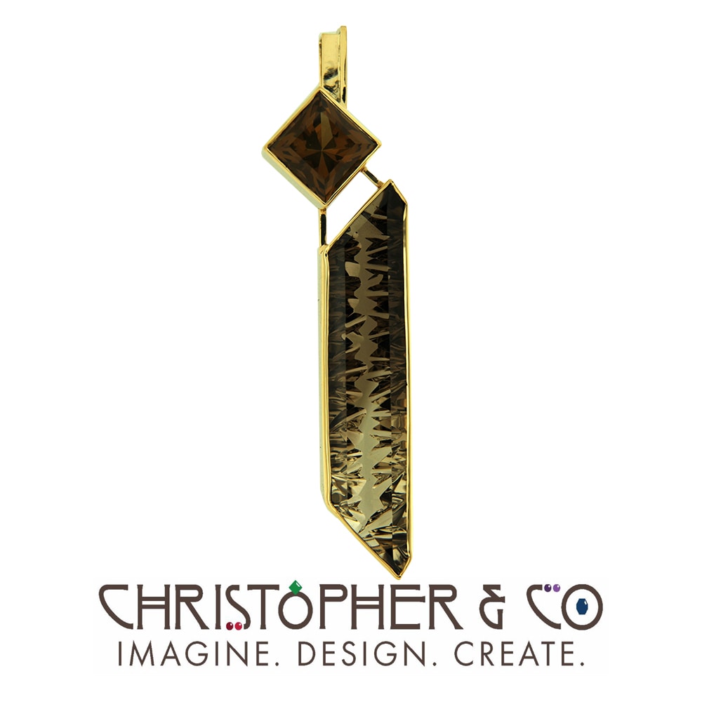 One 14 karat yellow gold pendant designed by Christopher M. Jupp. The pendant is set with one 7.03 carat cognac faceted citrine and one smokey quartz carving which was hand cut by Brian Messing.