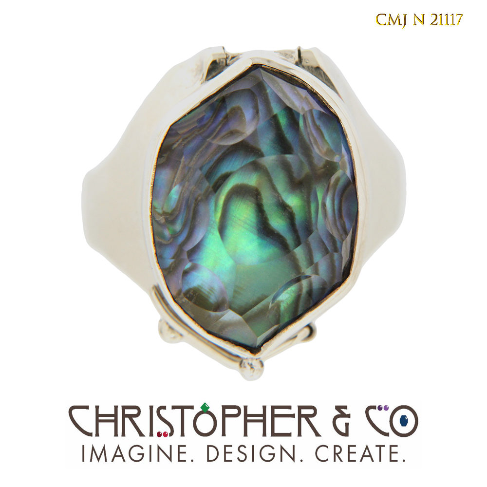 One 14 karat white gold ring designed by Christopher M. Jupp. The ring is set with a rose quartz and mother of pearl triplet handcut by Richard Homer. The ring was designed with a hinged top that opens.