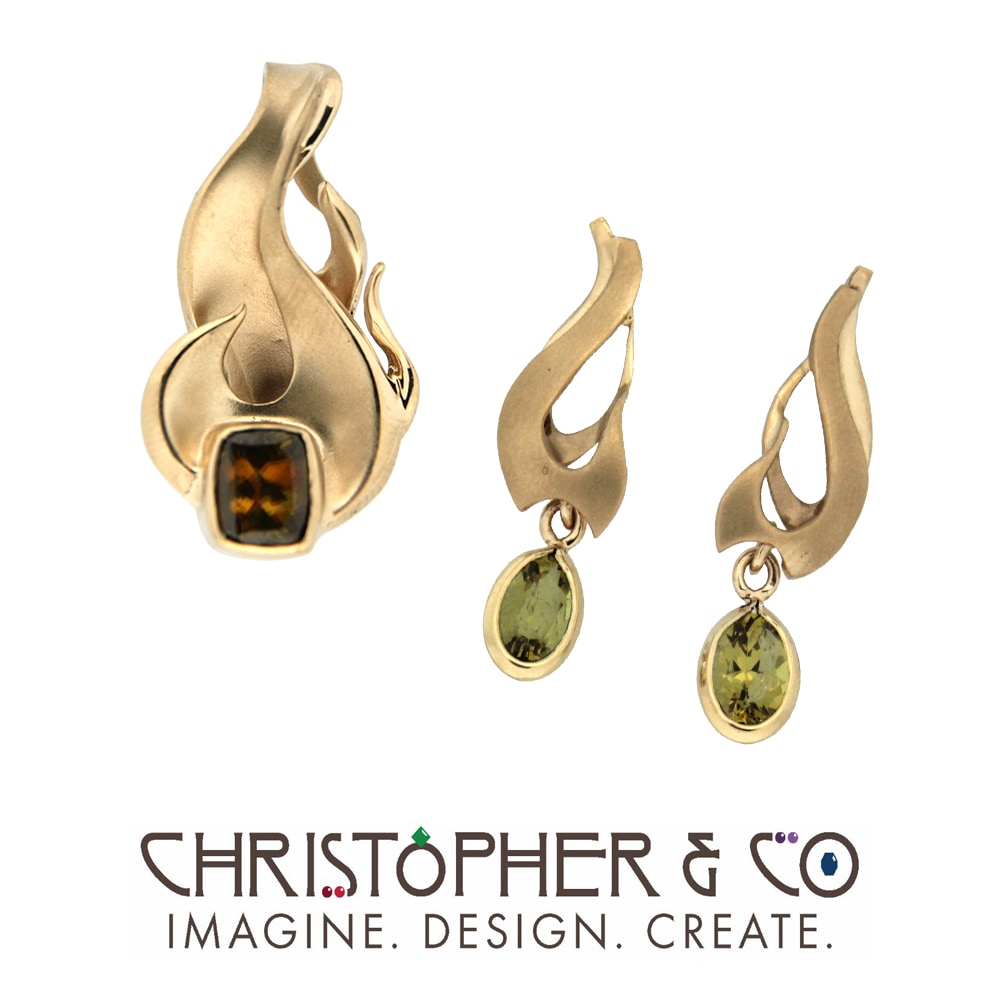 One 14 karat yellow gold pendant designed and handcrafted by Christopher M. Jupp. This pendant is set with one sphene which has a total weight of 2.83 carats