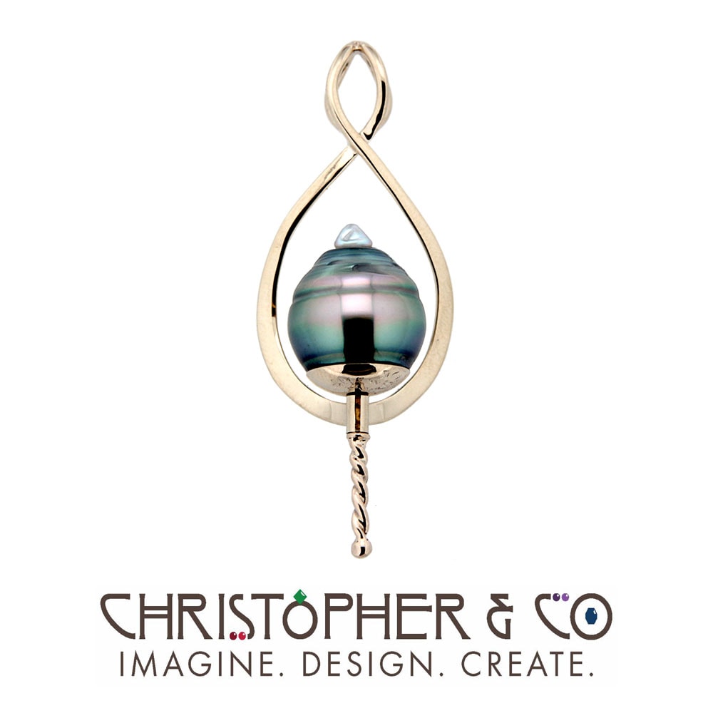 One 14 karat yellow gold pendant designed and handcrafted by Christopher M. Jupp. This pendant is set with one 12.5 x 15.1 mm Tahitian drop pearl.