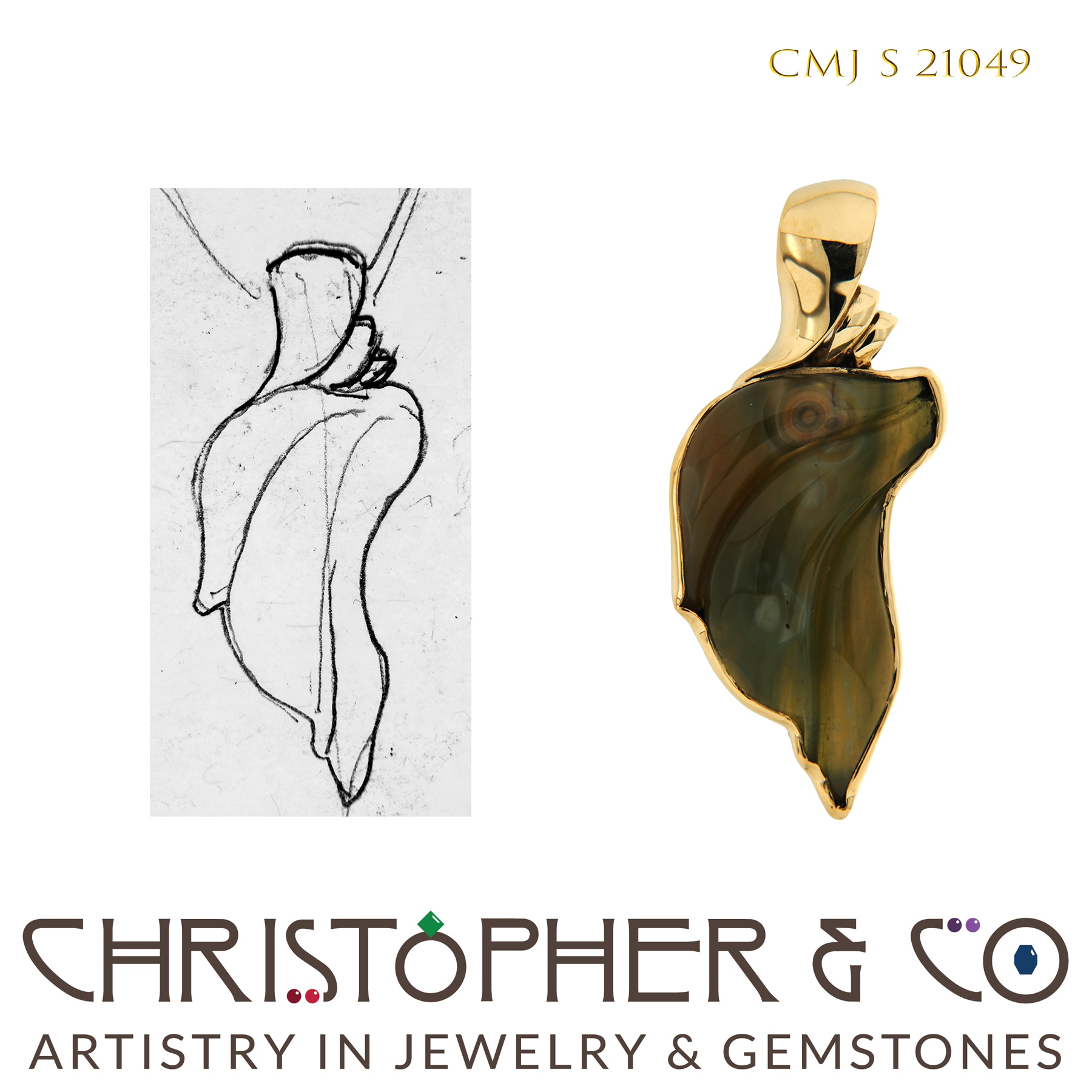 One 14 karat yellow gold pendant designed by Christopher M. Jupp. The pendant is set with one ocean jasper which was hand carved by Darryl Alexander.