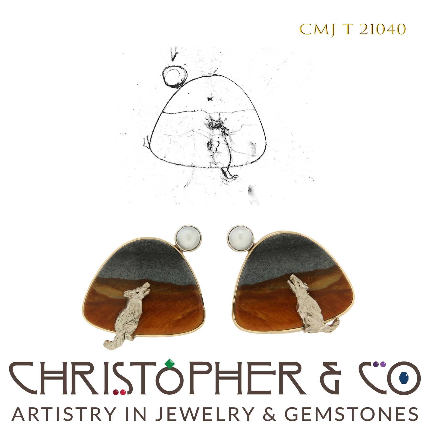 14 karat yellow and white gold earring pair designed by Christopher M. Jupp. The earrings are set with one pair of jasper cabochons and tow 4 mm round white pearls.