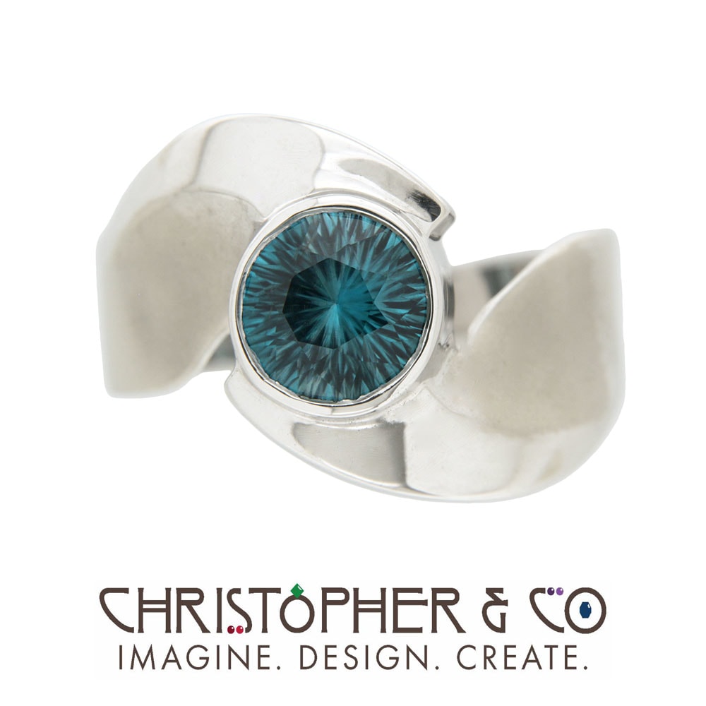 One 14 karat white gold ring designed by Christopher M. Jupp. The ring is set with one 3.13 carat concave cut brilliant round windex blue zircon which was handcut by Richard Homer.